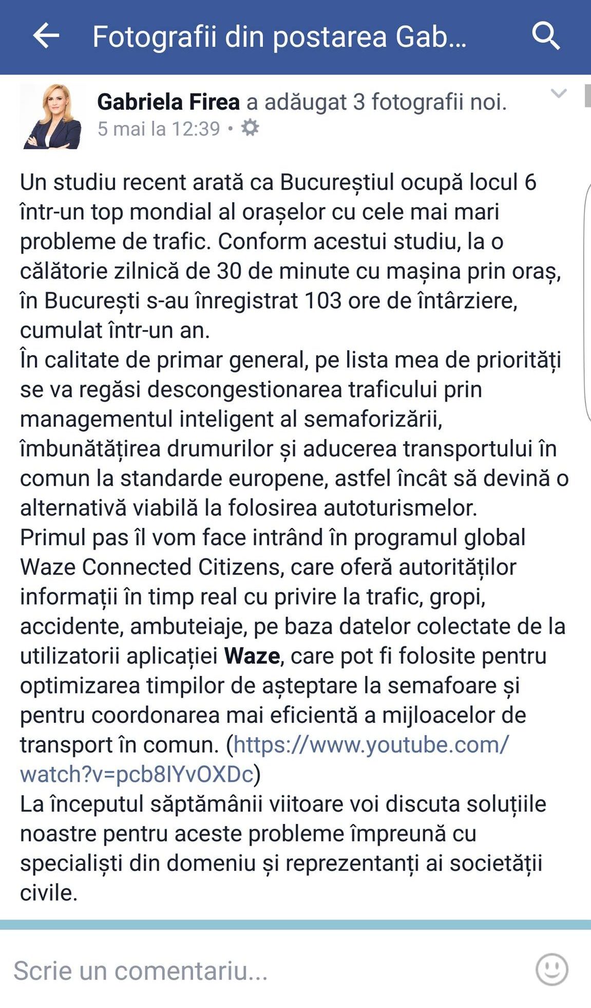 Gabriela Firea spunea într-un anunţ făcut săptămâna trecută pe contul său de Facebook că își dorește ca instituția să ia parte la programul Waze Connected Citizens și să facă un nou soft dedicat pentru prelucrarea datelor Waze. Totuşi, se pare că, un parteneriat între Waze și Primăria Capitalei există deja, fapt susținut chiar de către comunitatea Waze România prin intermediul unui comunicat oficial.