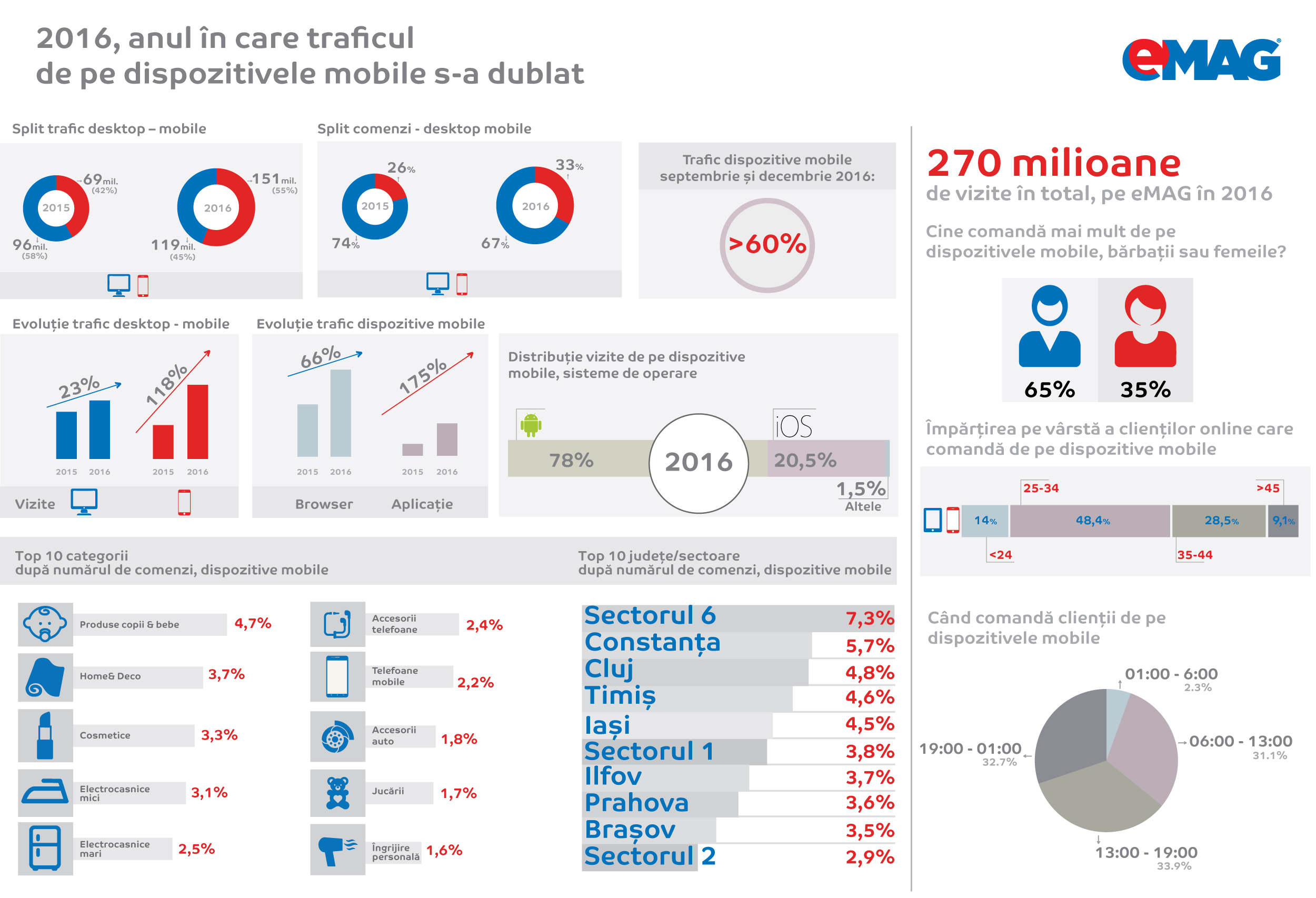 Pe vârste, datele arată că 48,4% dintre utilizatori au între 25 și 34 de ani, categorie urmată de cei între 35 și 44 de ani (28,5%). De asemenea, cei mai mulți clienți care au accesat site-ul eMAG de pe dispozitivele mobile sunt din București – Sectorul 6, Constanța, Cluj, urmate de Timiș, Iași, București – Sector 1, Ilfov, Prahova, Brașov și București – Sector 2.