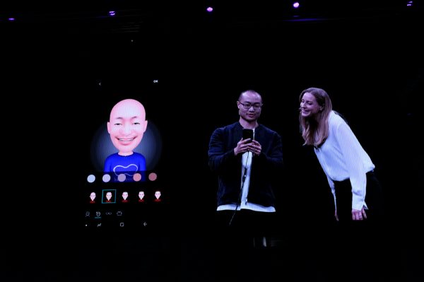 19:37 Jonathan Wong urcă pe scenă pentru a se juca cu Emoji-urile cu inteligență artificială. Utilizatorii vor avea de ales de la stiluri de păr, la ochelari și haine, mai ales pentru că S9 scanează trăsăturile faciale.