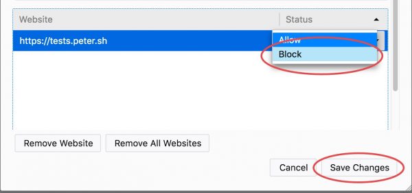 Schimbă ALLOW în BLOCK și apoi selectează SAVE CHANGES.