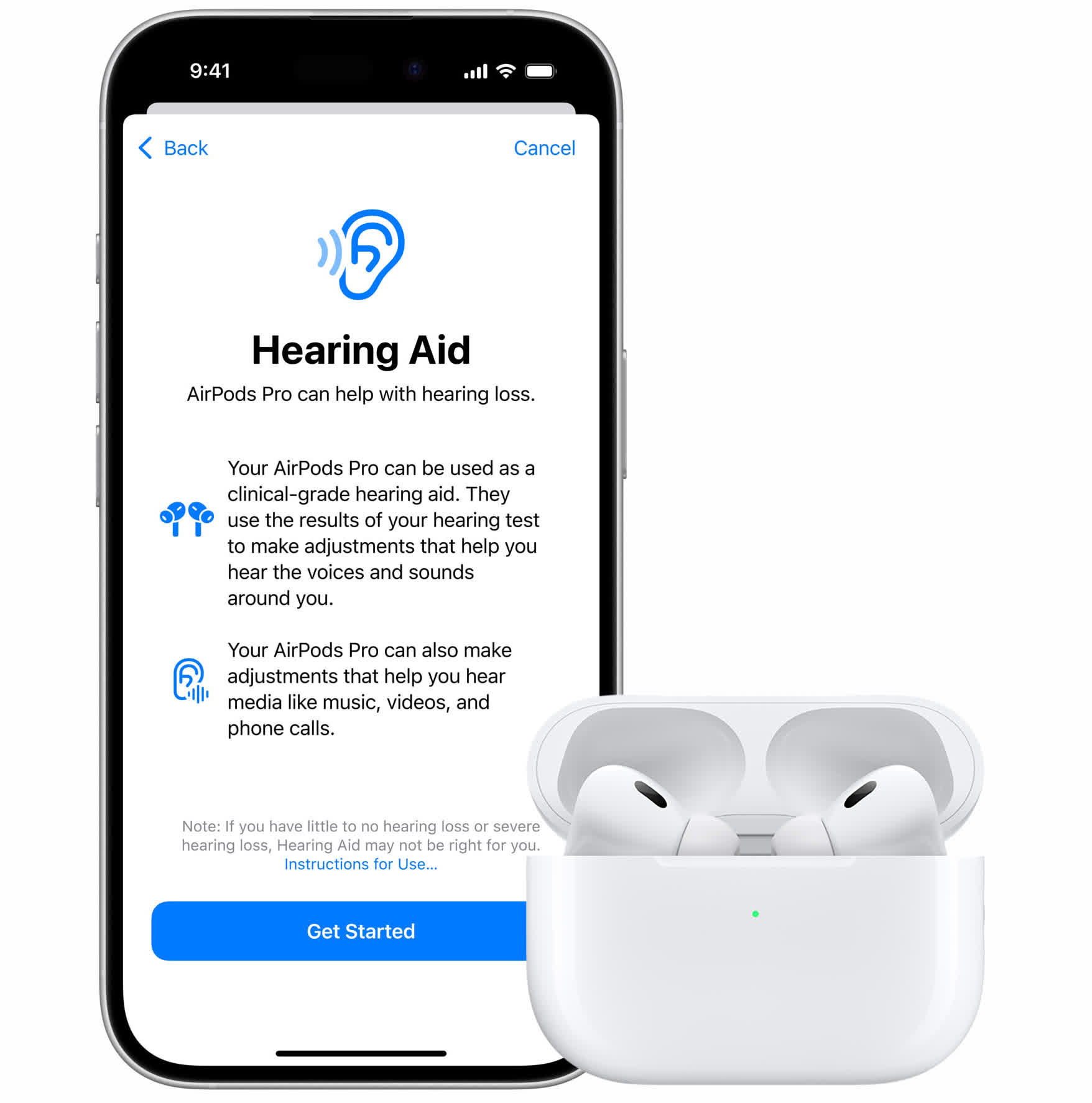 Aprobarea FDA se aplică în mod specific aplicației „Hearing Aid” de la Apple, care permite utilizatorilor să ajusteze modul în care AirPod-urile lor gestionează nivelurile de zgomot și răspund la diferite sunete externe. Profesioniștii din domeniul sănătății urechii pot crea audiograme pentru aplicație, care au fost testate folosind metode științifice dovedite. Toți utilizatorii pot genera un profil de auz personalizat, care afectează modul în care AirPod-urile procesează muzica, videoclipurile, jocurile și alte intrări audio. În plus, AirPods Pro 2 va primi software pentru a ajuta utilizatorii să prevină și să diagnosticheze pierderea auzului.