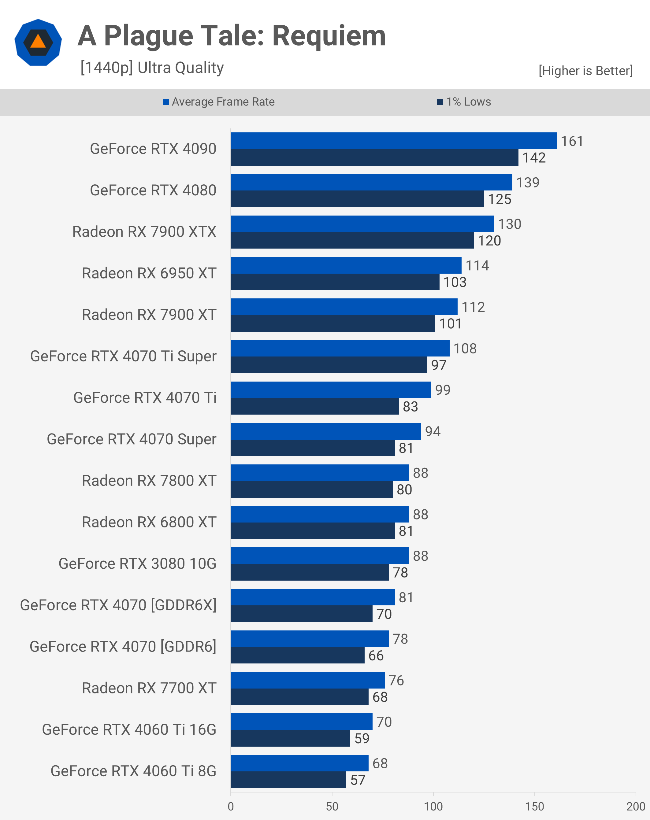În cele din urmă, în A Plague Tale: Requiem, vedem încă o reducere de 4% a performanței, scăzând de la 81 fps la 78 fps – o pierdere de doar câteva cadre. Încă o dată, acest lucru aduce RTX 4070 mai aproape ca performanță de mult mai ieftin 7700 XT.