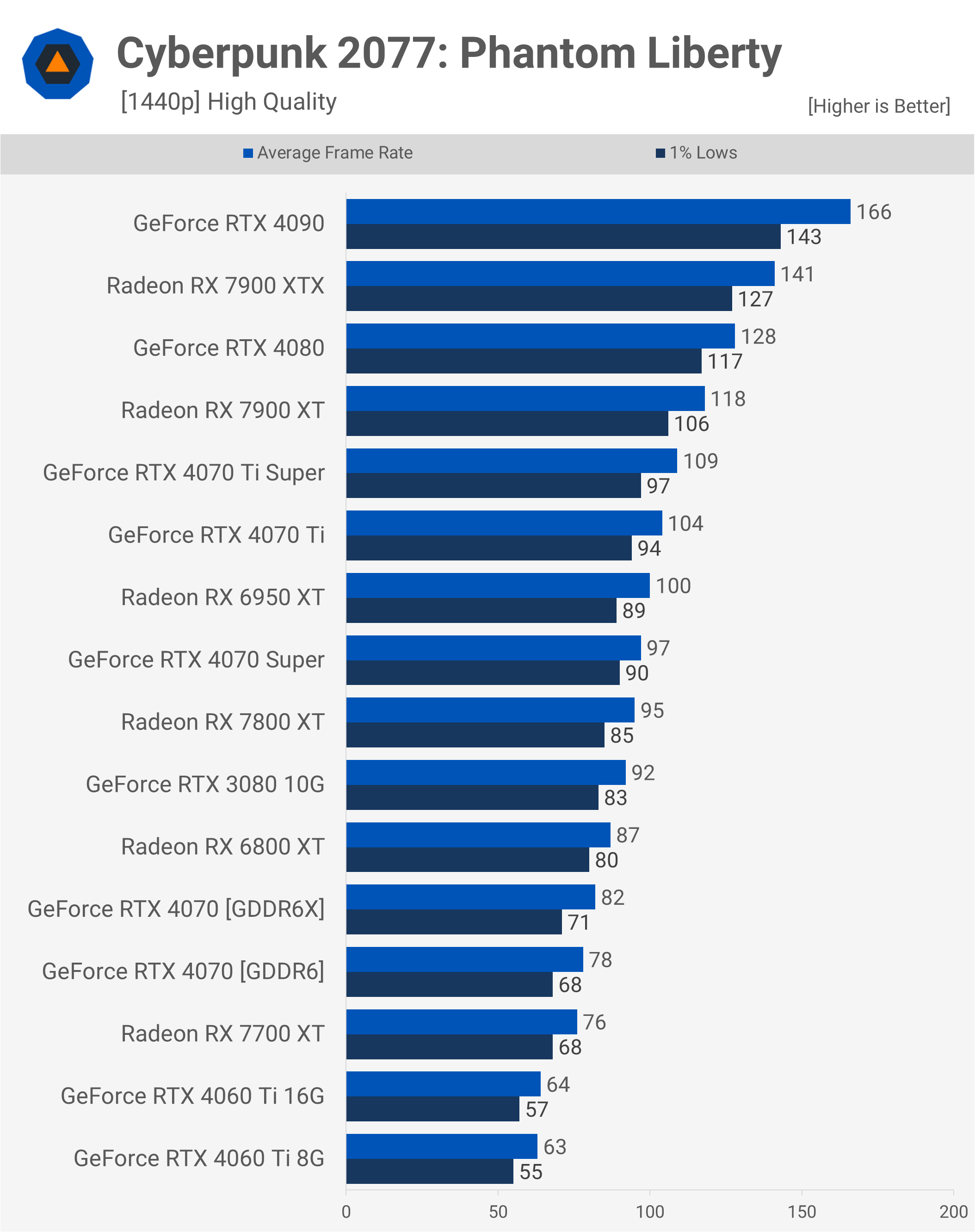 În Cyberpunk 2077 Phantom Liberty la 1440p, vedem o reducere a performanței cu 5% – aceasta este cea mai mare scădere a performanței din oricare dintre benchmark-uri, alertă spoiler. Drept urmare, RTX 4070 este acum cu doar 3% mai rapid decât mult mai ieftin 7700 XT.