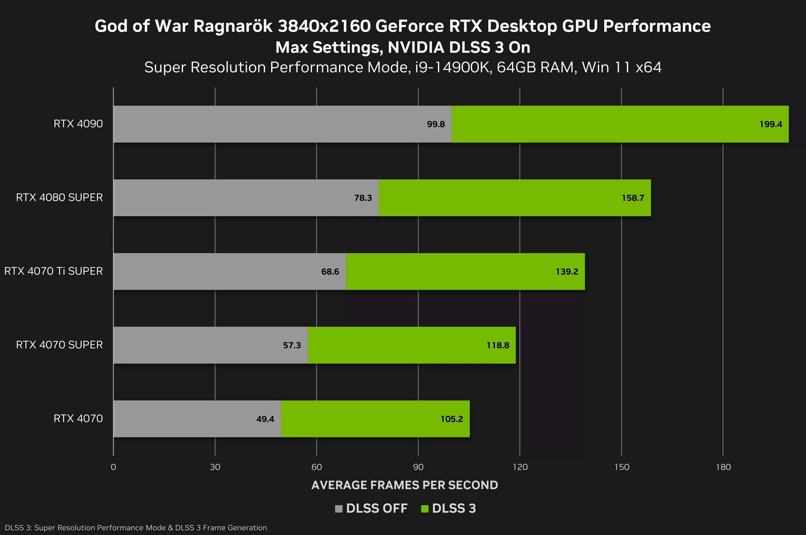 În plus, Nvidia a împărtășit câteva benchmark-uri interne, folosind Ragnarok pentru a prezenta GPU-urile GeForce RTX 4000 și generația de cadre DLSS 3. Cu DLSS setat la modul de performanță în 4K la setările grafice maxime, un RTX 4070 poate avea o medie de peste 105 cadre pe secundă decente.