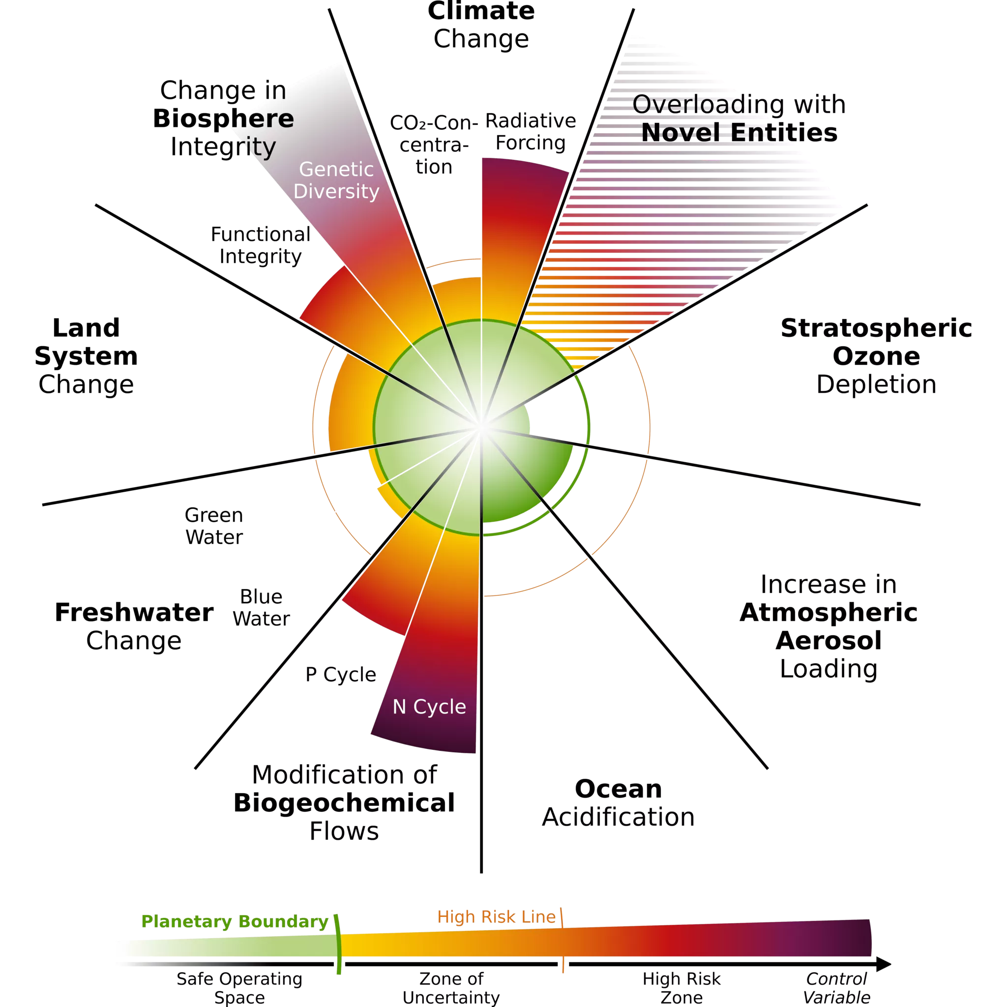 Cele nouă sisteme descrise de cadrul planetar al PIK includ următoarele limite: schimbările climatice; introducerea unor entități noi în ecosistem (substanțe chimice de sinteză); epuizarea stratului de ozon din stratosferă; creșterea aerosolului atmosferic; acidificarea oceanelor; fluxuri biogeochimice; schimbări de apă dulce; modificări ale sistemului funciar; și integritatea biosferei.