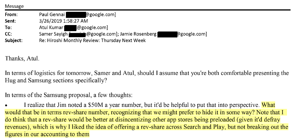 Epic Games evidențiază funcția Auto Blocker a Samsung Galaxy ca fiind „cea mai recentă dintr-o serie lungă de tranzacții în care Google și Samsung au convenit să nu concureze pentru a proteja puterea de monopol a Google”.