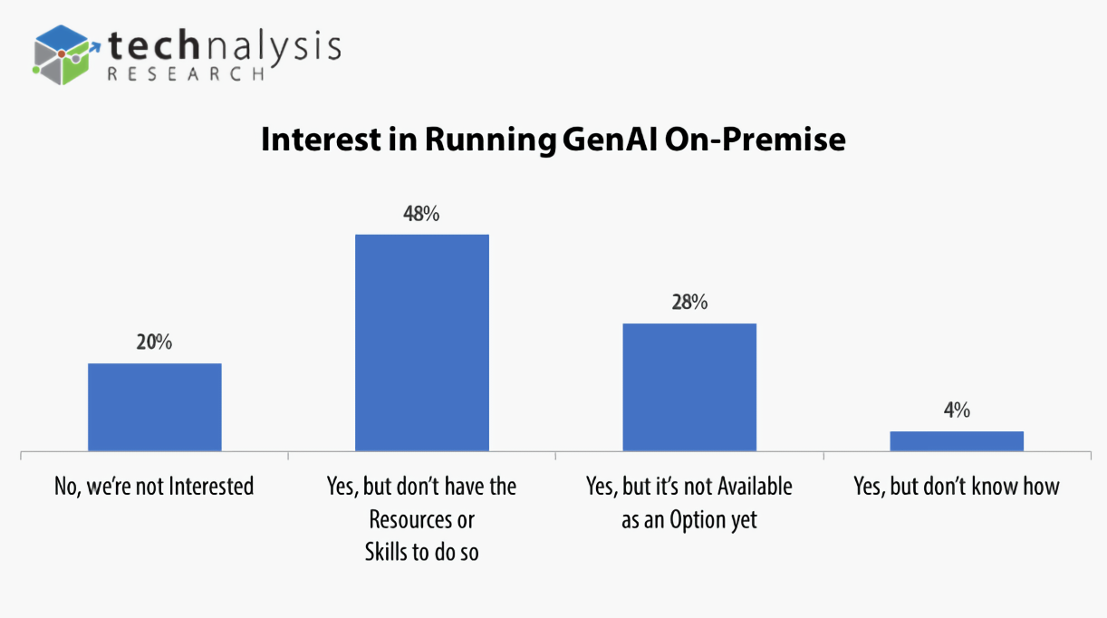 În timp ce eforturile GenAI bazate pe cloud continuă să domine și probabil vor rămâne majoritare pentru ceva timp, un remarcabil 80% dintre respondenți și-au exprimat un anumit grad de interes față de implementările locale. Această schimbare de la practicile consacrate din industrie reprezintă o oportunitate semnificativă pentru participanții industriei GenAI de a dezvolta noi produse, servicii și soluții pentru a satisface aceste nevoi.