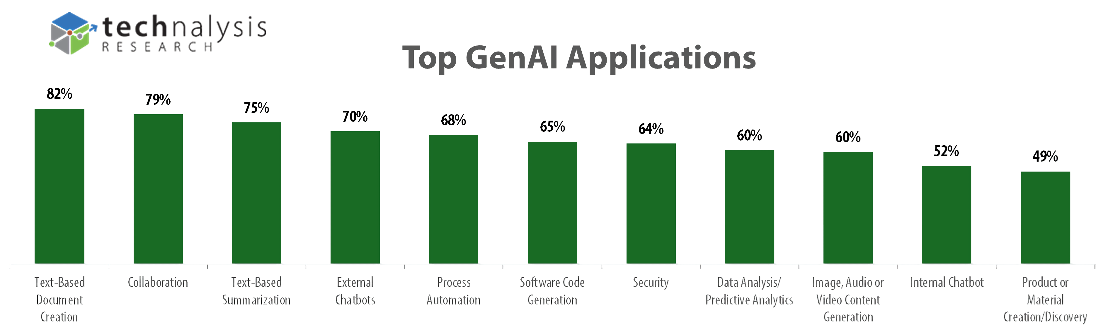 În ceea ce privește aplicațiile bazate pe GenAI pe care organizațiile le folosesc, așa cum ilustrează Figura 3, prima și a treia opțiune de top sunt legate de text cu Crearea documentelor bazate pe text numărul unu și Rezumatul bazat pe text numărul trei.
