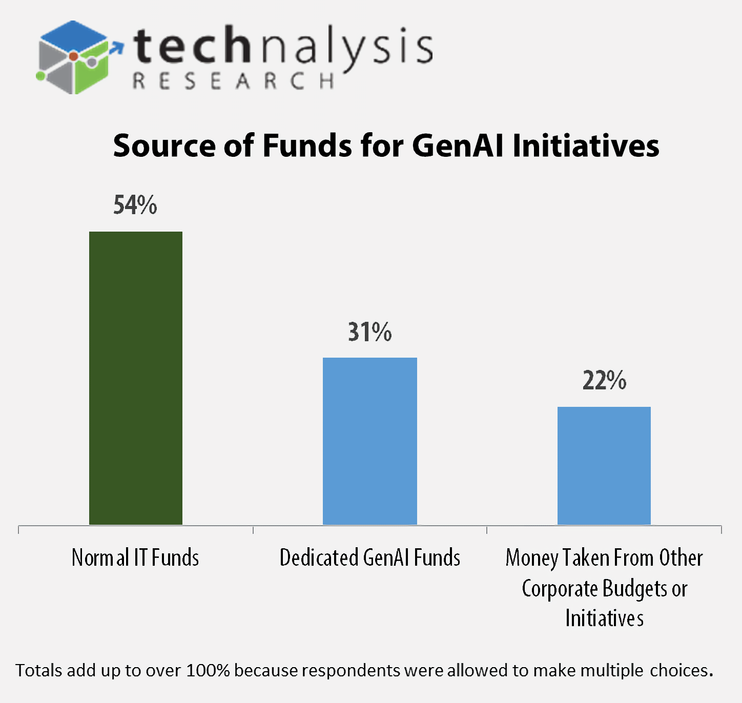 Rezultatele studiului arată că nu numai că investițiile în inițiativele GenAI continuă, dar și companiile găsesc noi surse de finanțare pentru a sprijini aceste eforturi. Peste jumătate dintre respondenții la sondaj au spus că folosesc fonduri din afara IT-ului tradițional pentru a ajuta la plata acestor eforturi – 31% din bugete speciale dedicate GenAI și alte 22% din alte bugete sau inițiative corporative, cum ar fi unitățile de afaceri.