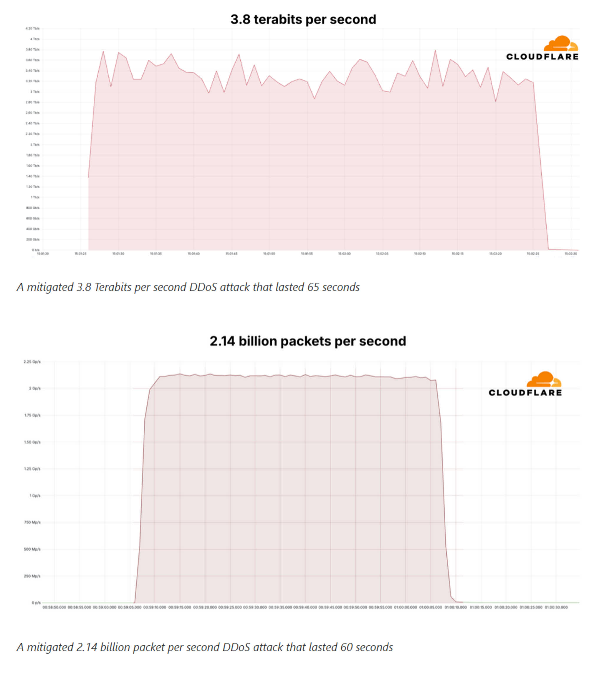Cel mai mare atac a implicat 3,8 Tbps de trafic rău intenționat, cu care infractorii cibernetici au încercat să inunde un singur client în doar un minut. Sistemele Cloudflare au detectat și atenuat acest atac DDoS „record mondial” fără nicio intervenție umană.