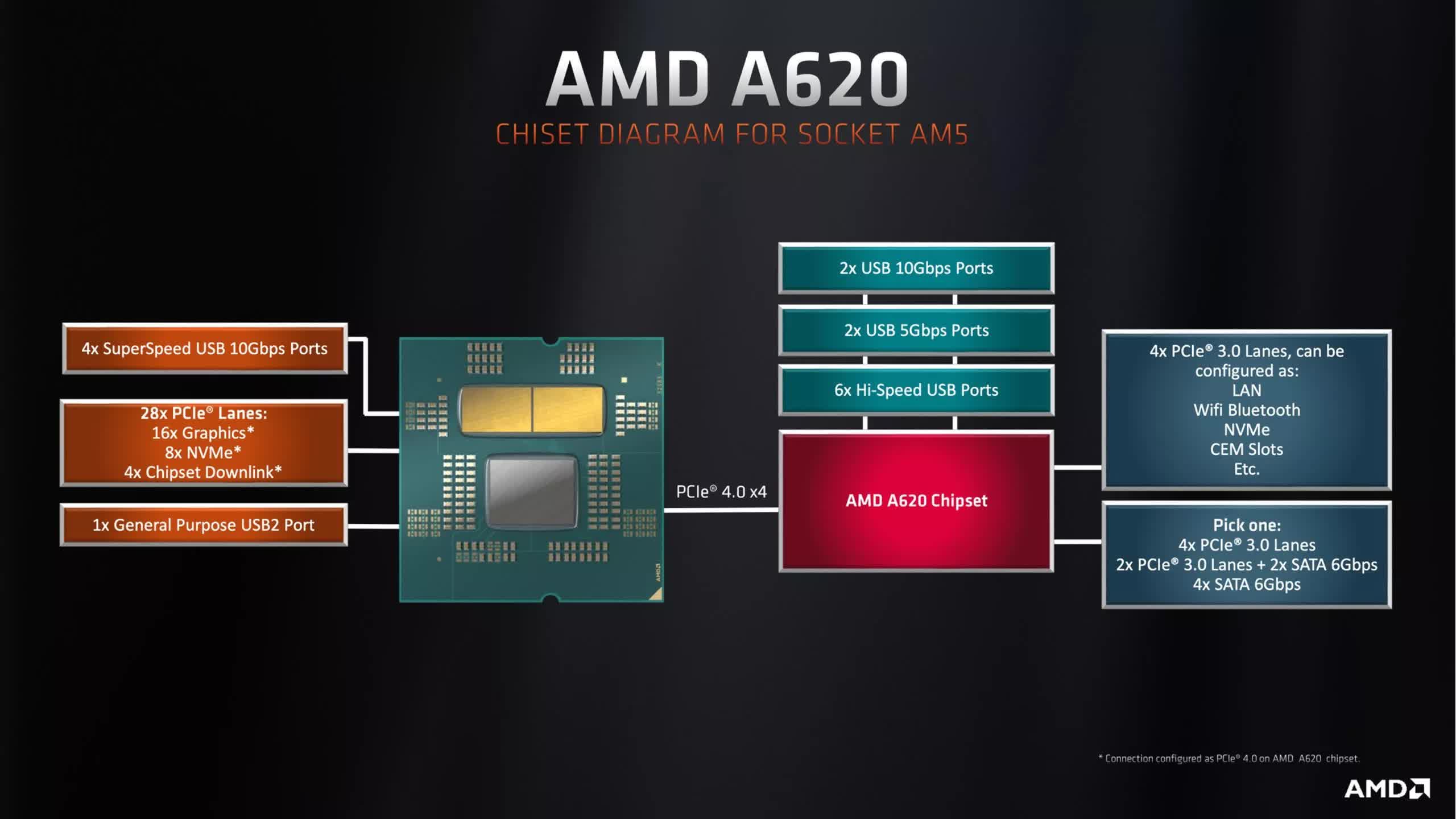 Plăcile de bază A620 folosesc același cip Promontory 21 folosit în plăcile de bază B650 și X870, dar cu unii dintre conectorii săi dezactivați sau limitati. Acesta adaugă suport pentru două USB 3.1, două USB 3.0 (sau „3.2 Gen 1”) și șase porturi USB 2.0. De asemenea, include opt benzi PCIe 3.0, dintre care două sau patru pot fi folosite pentru porturile SATA.