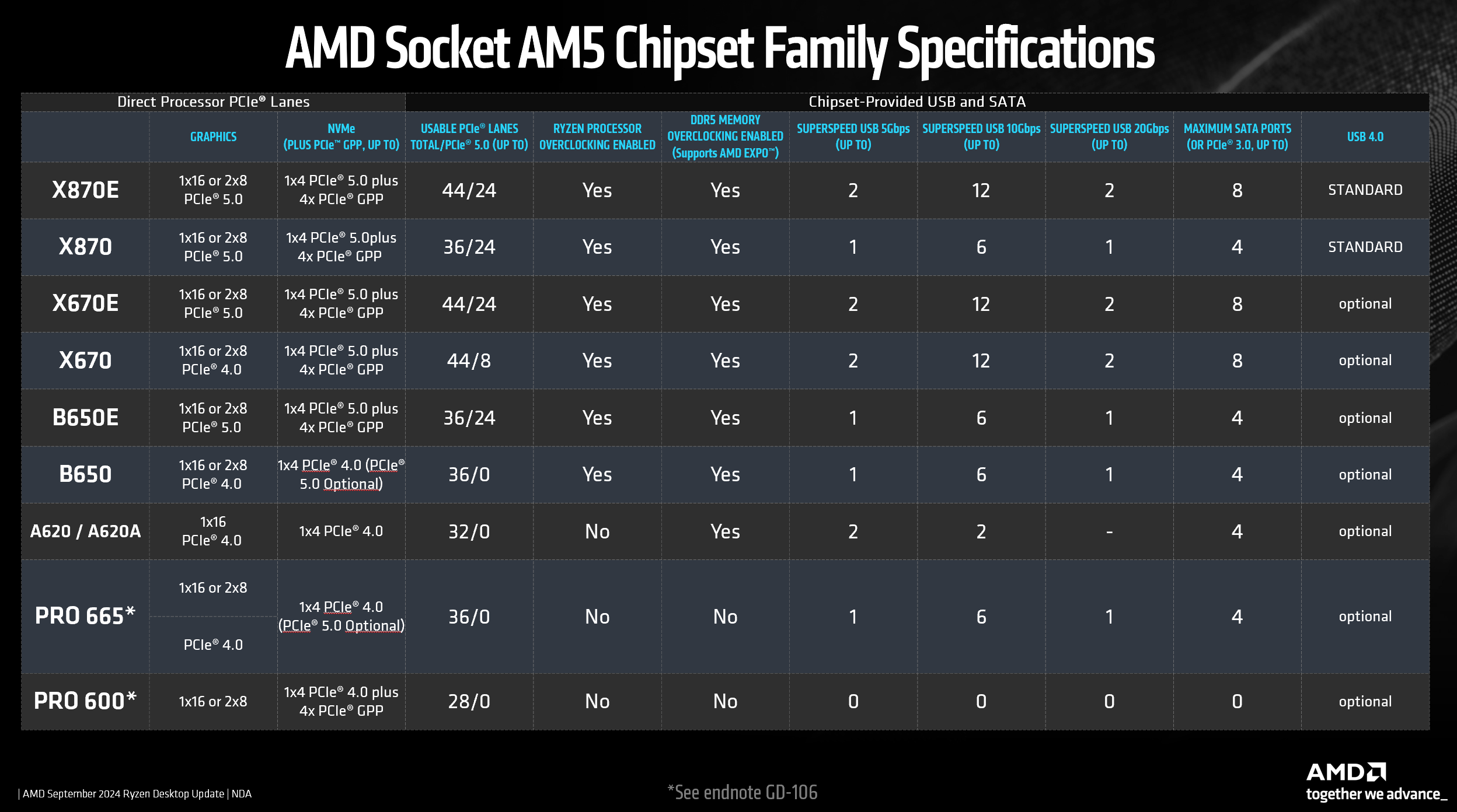 Toate chipset-urile actuale de pe platforma AM5 acceptă doar viteze PCIe 4.0, ceea ce limitează lățimea de bandă totală a dispozitivelor conectate la acestea la aproximativ 7 GB/s. Aceste dispozitive pot cuprinde unități de stocare care utilizează fie interfața NVMe, fie SATA, dispozitive USB, plăci de rețea și alte componente interne, cum ar fi plăcile de sunet.