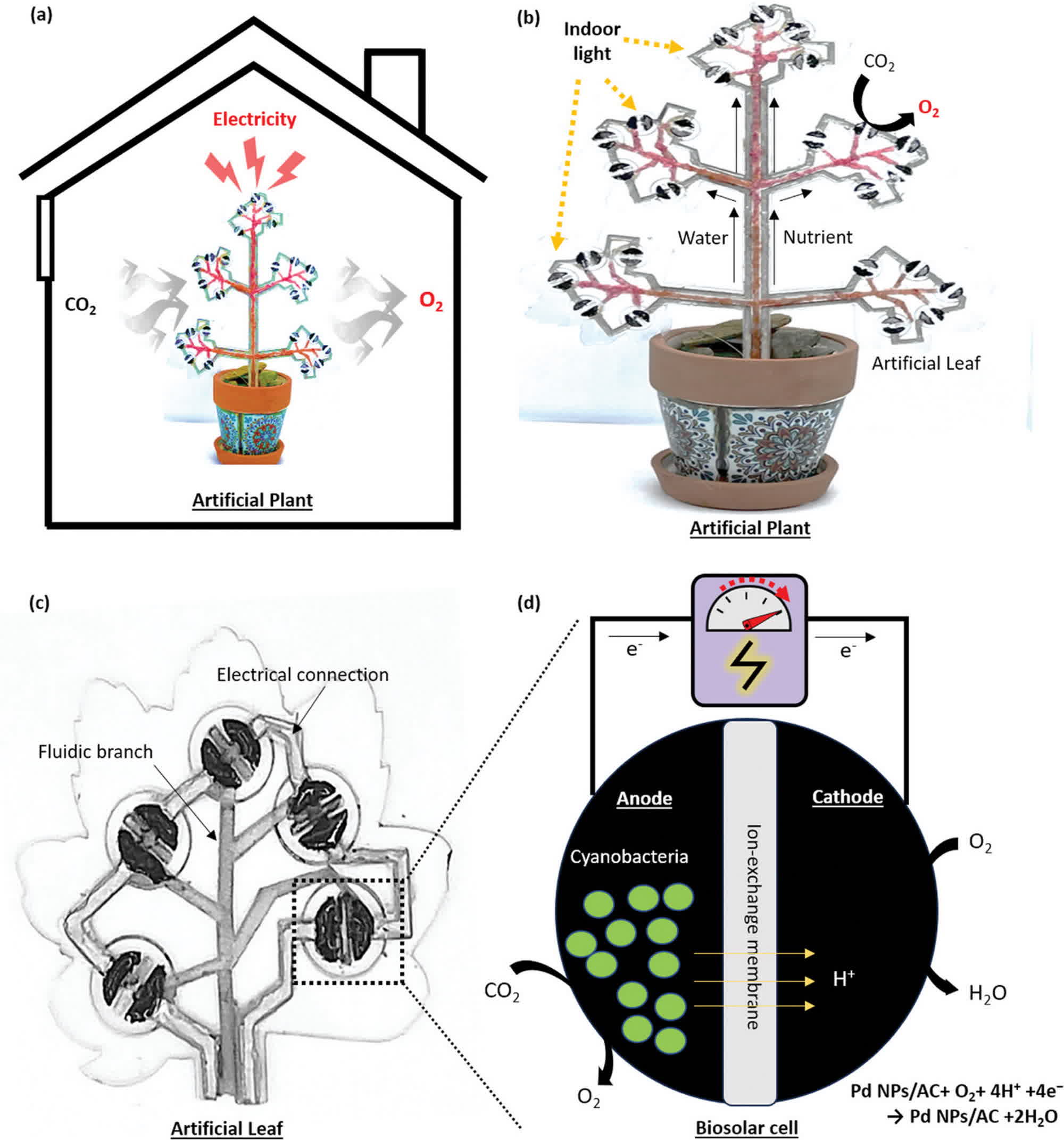 Planta artificială are cinci frunze, fiecare conținând „celule solare biologice” și necesită apă și substanțe nutritive la fel ca o plantă naturală. Sistemul imită procesele care alimentează fotosinteza naturală, cum ar fi transpirația și acțiunea capilară, produsele secundare fiind oxigenul și o tensiune în circuit deschis de 2,7 V, împreună cu o putere maximă de ieșire de 140 µW.