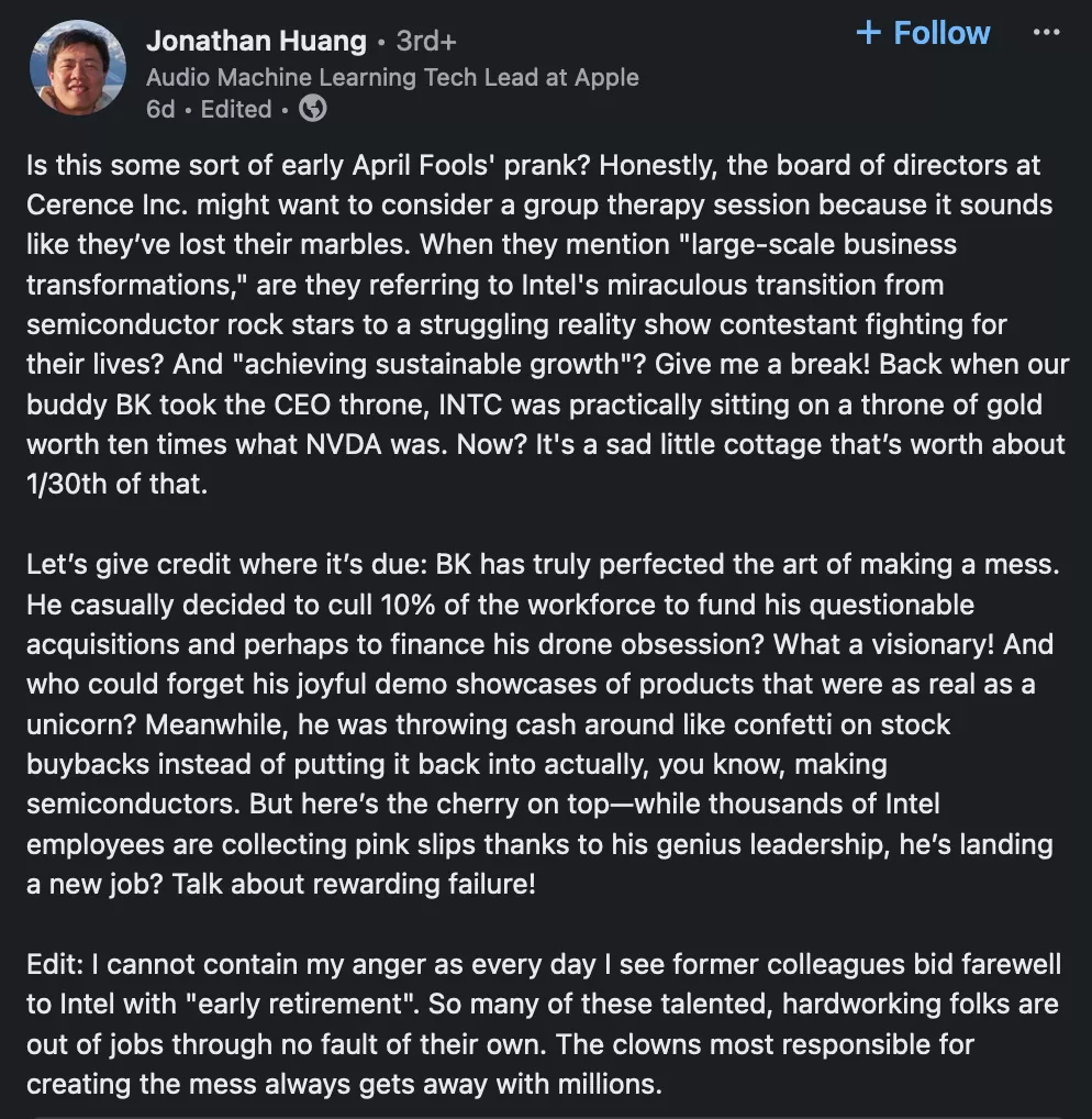 Una dintre cele mai usturatoare critici a venit de la Jonathan Huang, un fost veteran Intel acum la Apple. Huang l-a criticat mai întâi pe Cerence, spunând că consiliul de administrație ar fi putut „și-ar fi pierdut bilele”. El l-a criticat sarcastic pe Krzanich pentru că „a perfecționat arta de a face mizerie” și i-a lipsit viziunea în timp ce conducea Intel.