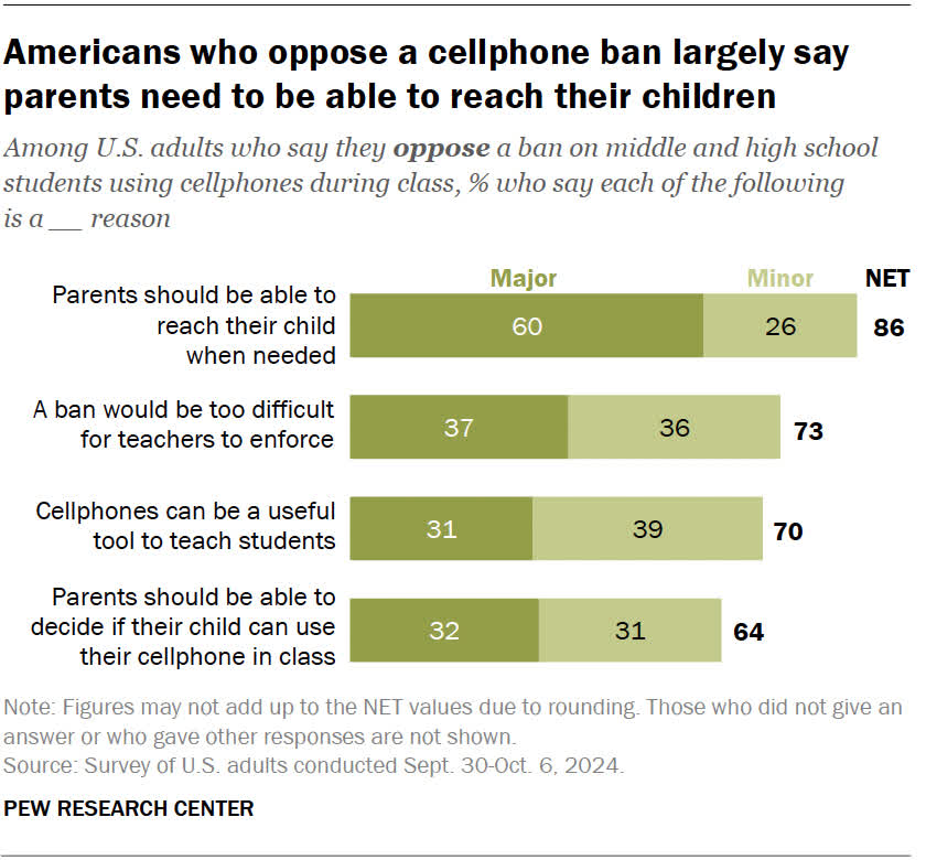 Deloc surprinzător, a putea ajunge la un copil atunci când a fost nevoie a fost motivul cel mai popular pentru a se opune unei interdicții în timpul orei, citat de 86% dintre participanți. Celelalte motive au fost că interdicția ar fi prea greu de aplicat (73%), că telefoanele sunt un instrument didactic util (70%) și că părinții, mai degrabă decât profesorii, statul sau guvernul, ar trebui să decidă dacă copilul lor pot folosi un telefon în clasă (64%).