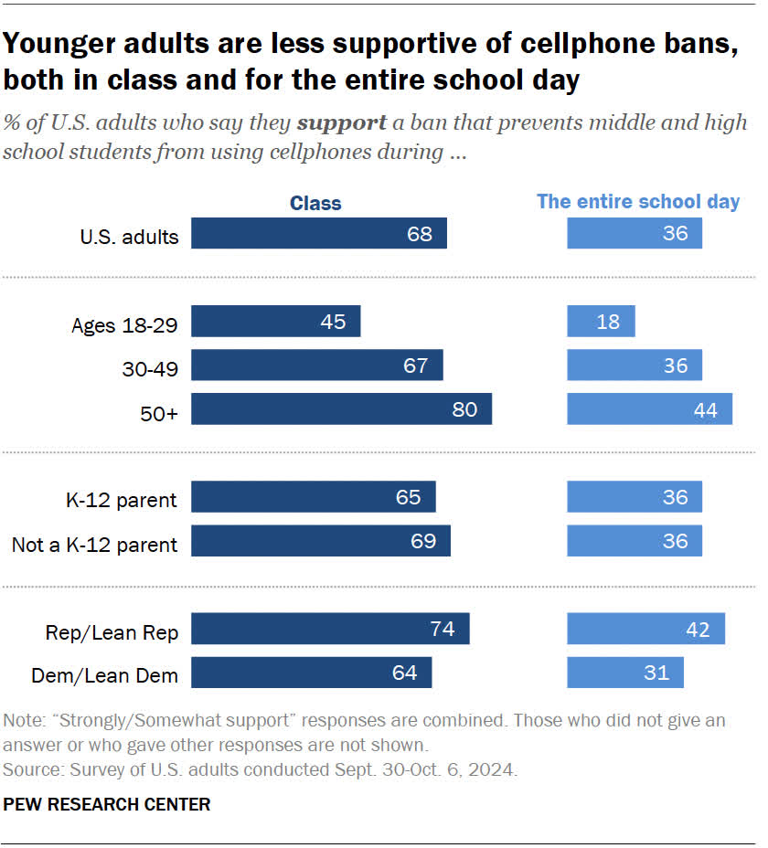 Adulții în vârstă au susținut mai mult interdicțiile atât în sala de clasă, cât și în întreaga zi de școală, la fel ca și republicanii autoidentificați.