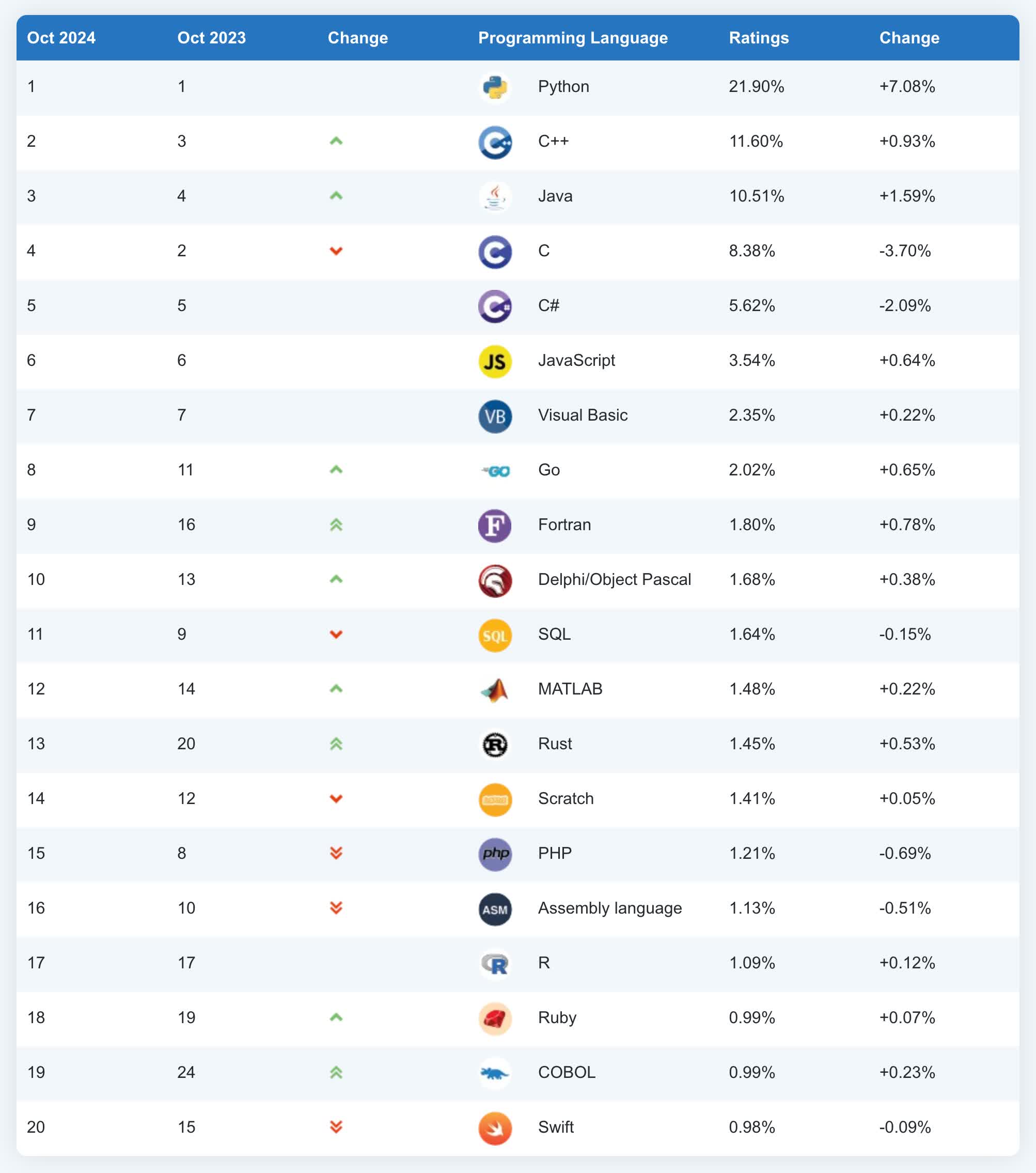 Pentru octombrie 2024, Python continuă să domnească ca cel mai popular limbaj de programare, crescând cu +7,08% în ultima lună și deținând o cotă de piață de 21,90%. C++ a ocupat locul doi cu 11,60 la sută, urmat de Java cu 10,51 la sută. Limbajul clasic C pierde însă teren, ocupându-se acum pe locul patru, cu o cotă de piață de 8,38%, în scădere cu 3,70%.