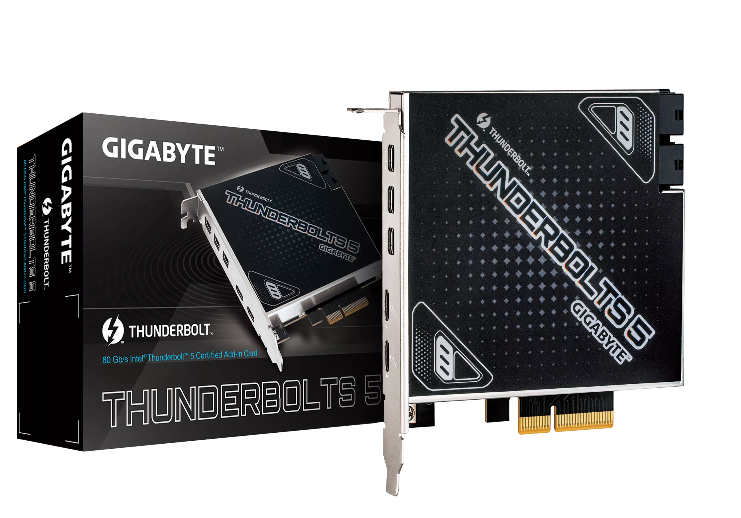Un card suplimentar care aduce standardul Intel Thunderbolt 5 pe desktop-uri compatibile a apărut recent pe site-ul Gigabyte. Această placă PCIe 4.0 adaugă cinci porturi de conexiune de mare viteză pentru o flexibilitate sporită. Cardul Thunderbolt 5 de la Gigabyte include două porturi USB-C și trei ieșiri Mini-DisplayPort. Conexiunile USB-C ale Thunderbolt 5 pot suporta două monitoare 4K la 144 Hz, în timp ce ieșirile DisplayPort ale cardului pot conduce un monitor 8K la 60 Hz prin DisplayPort 2.1.