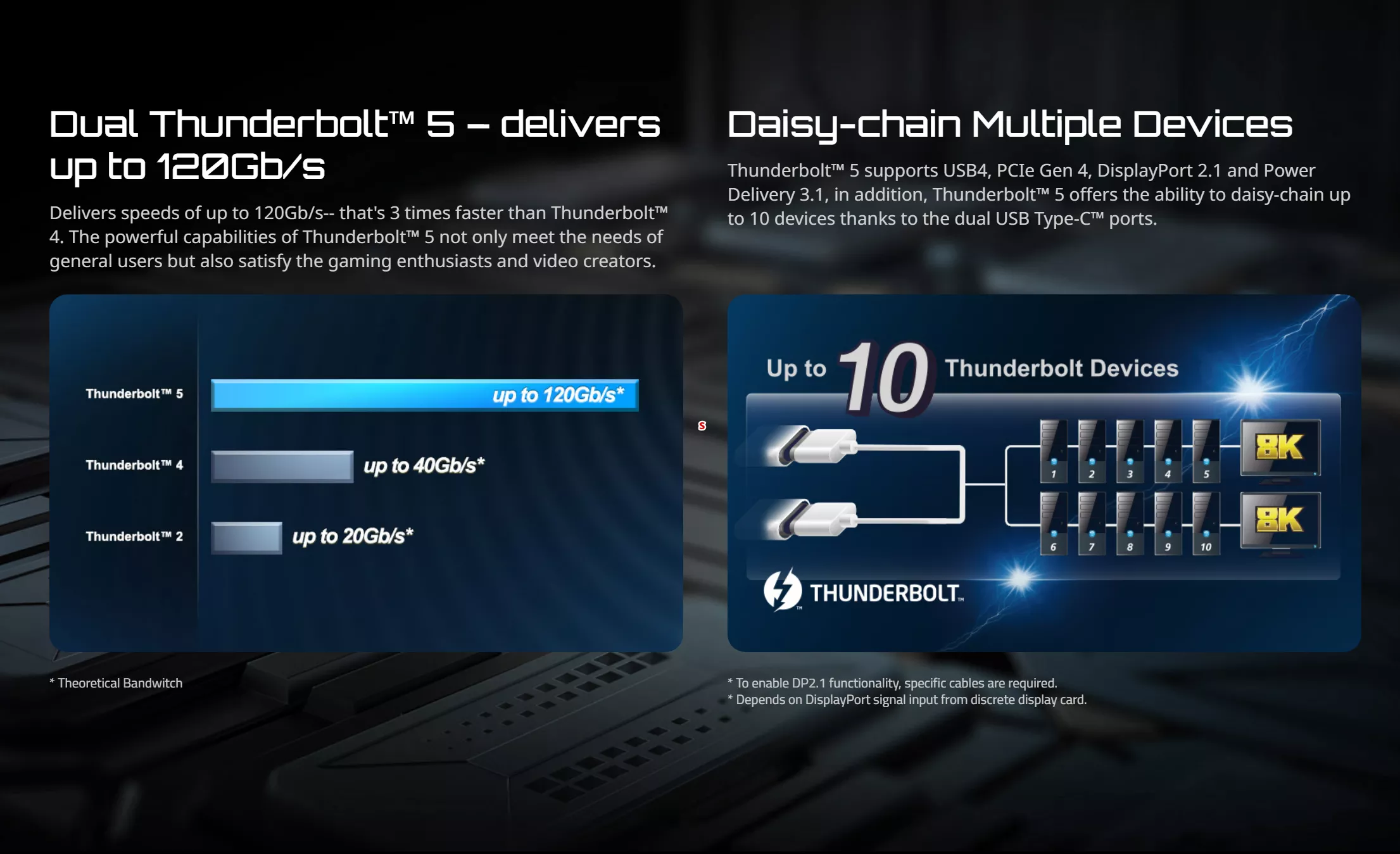 Utilizatorii pot conecta până la cinci dispozitive din fiecare port USB-C, iar Power Delivery 3.1 permite transmisia de putere de până la 100 W. Clienții pot consulta și un card suplimentar similar pe site-ul web al Asus – ThunderboltEX 5. Dispune de trei porturi DP 2.1 și două porturi USB-C, dar acceptă și încărcare rapidă de 130 W. Viitoarele dispozitive Thunderbolt 5 ar putea ajunge, teoretic, până la 240 W.