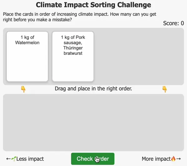 Încercați The Climate Impact Sorting Challenge! Un joc rapid pe care tocmai l-am făcut, care vă învață despre impactul asupra climei al diferitelor tipuri de alimente.