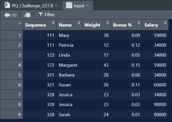 select(Sequence = Sequence.x,Name = Name.x, Weight, `Bonus %`, Salary) %>%