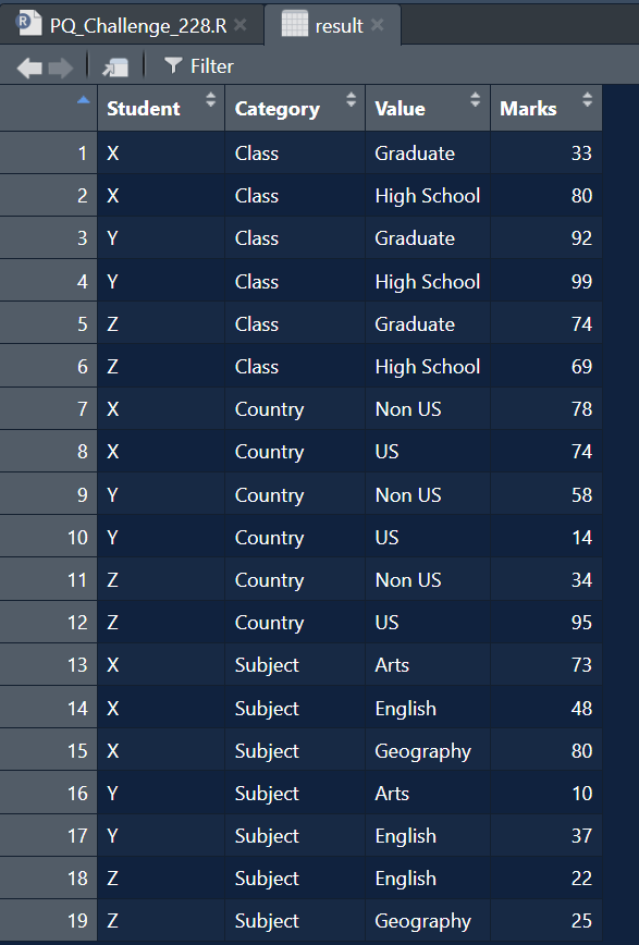 library(tidyverse) library(readxl) library(unpivotr) path = "Power Query/PQ_Challenge_228.xlsx" input = read_excel(path, range = "A1:H5", col_names = F) test = read_excel(path, range = "J1:M20") %>% arrange(Category, Student, Value)