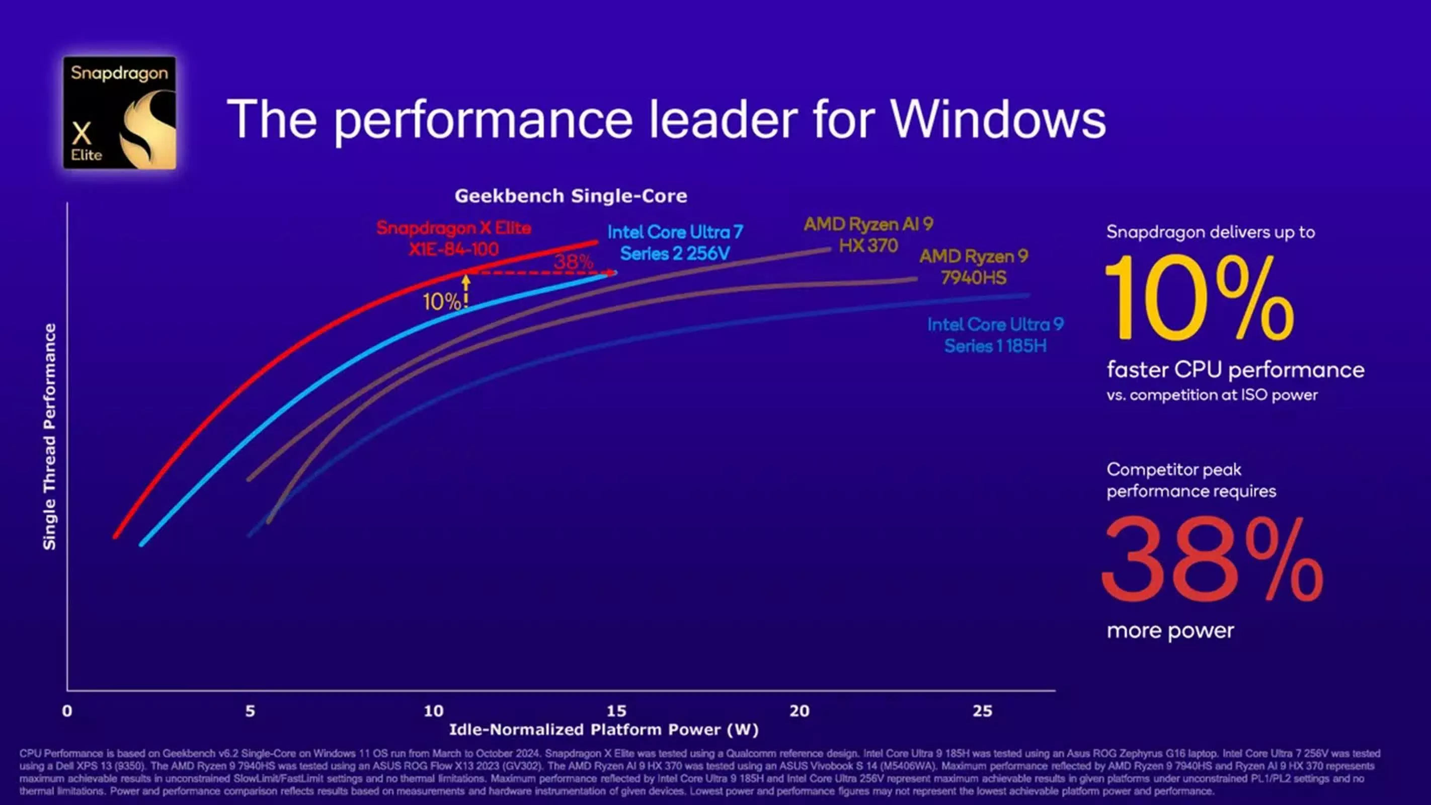 În testele Geekbench single-core, Snapdragon X1E-84-100 a depășit performanța Intel Core Ultra 7 Series 2 256V cu până la 10%, consumând în același timp cu 38% mai puțină energie.