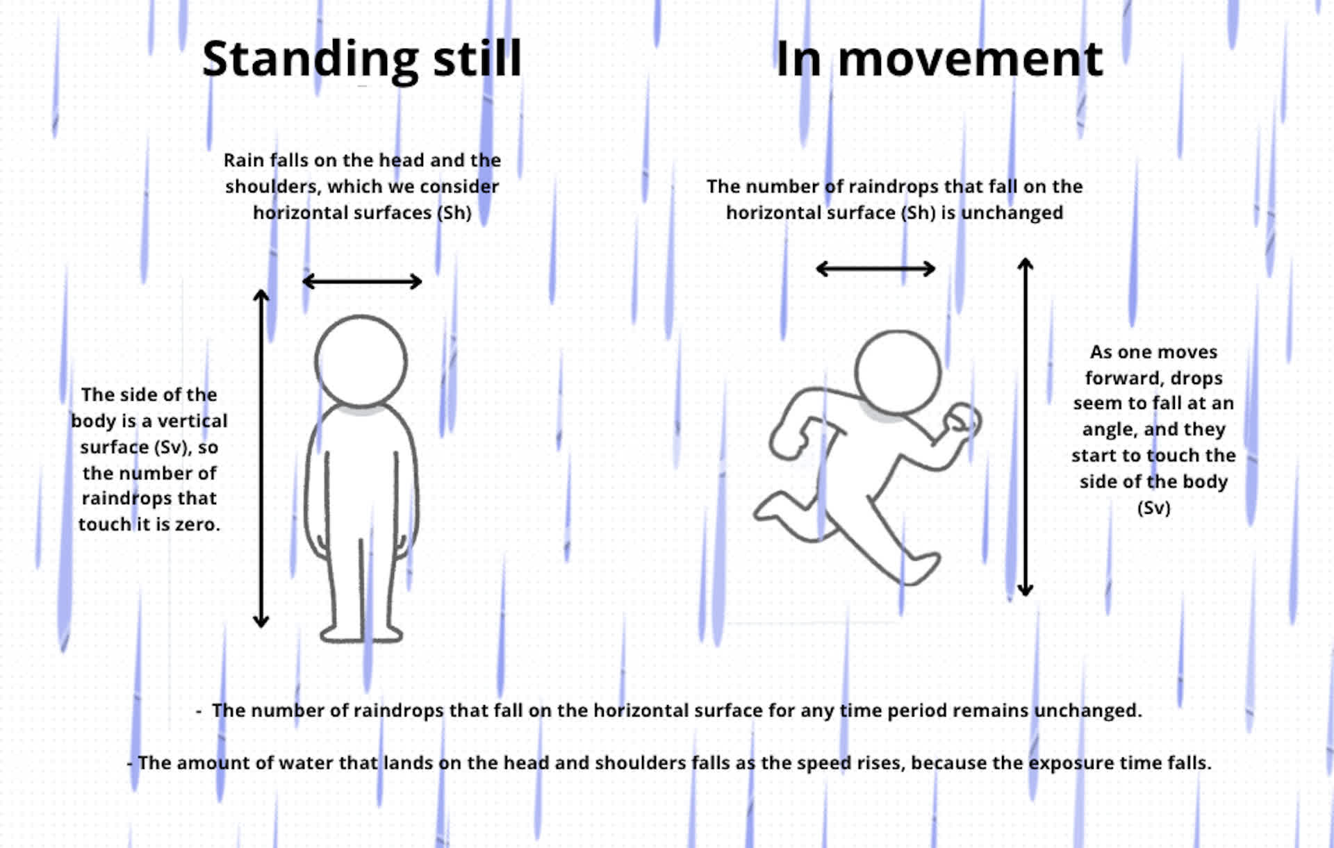 Cu toate acestea, deplasându-vă mai repede și reducând timpul petrecut în ploaie expusă, în cele din urmă întâlniți mai puțină apă totală care plouă pe zonele orizontale.