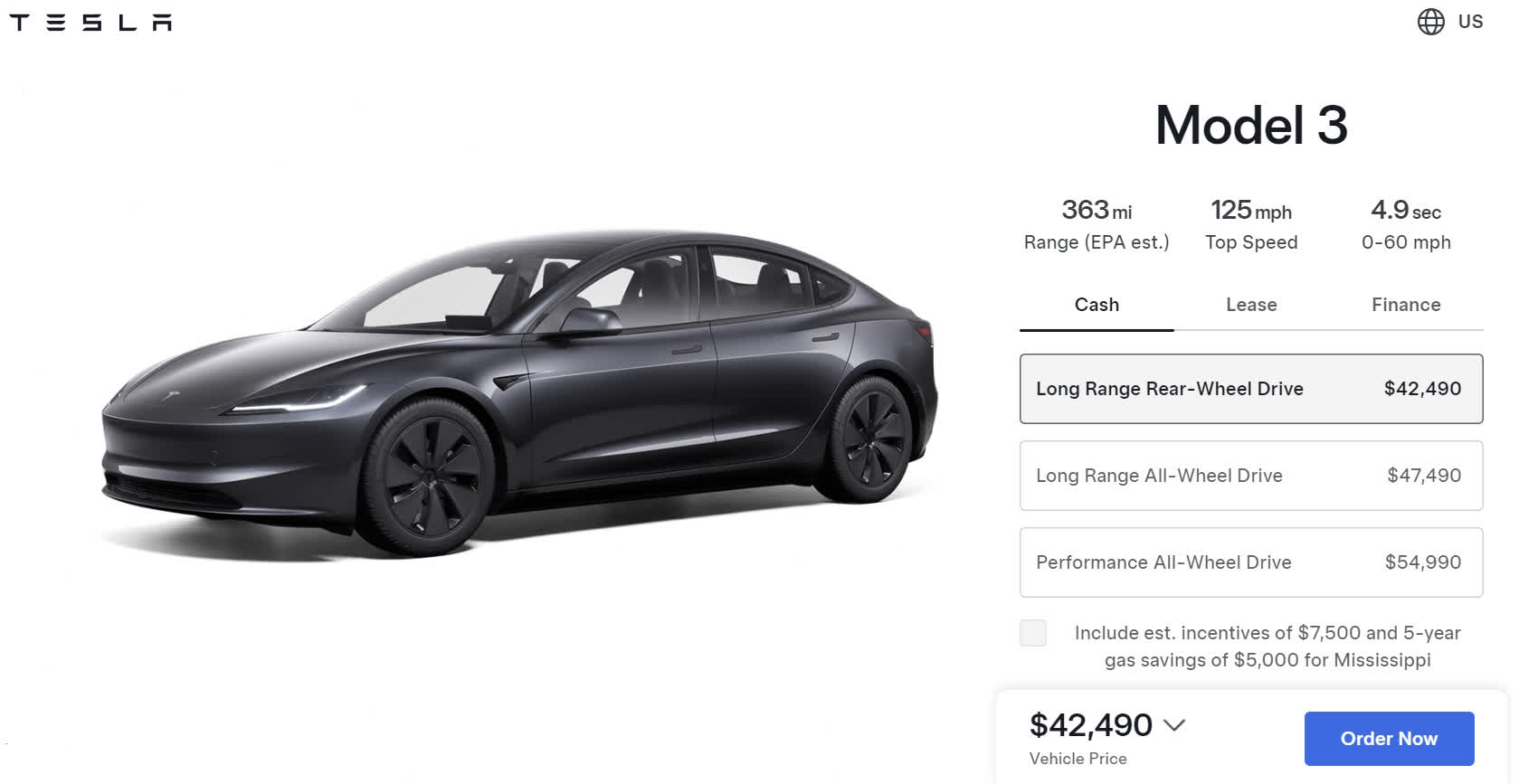 După ce în această lună a încetat gama standard de model 3, care avea un preț autocolant de 38.990 USD, cel mai ieftin vehicul pe care Tesla îl vinde în prezent este Modelul 3 cu tracțiune spate Long Range, la prețul de 42.490 USD înainte de subvenții. Engadget notează că prețul mediu al modelelor sale din 2024 este puțin peste 63.000 USD.