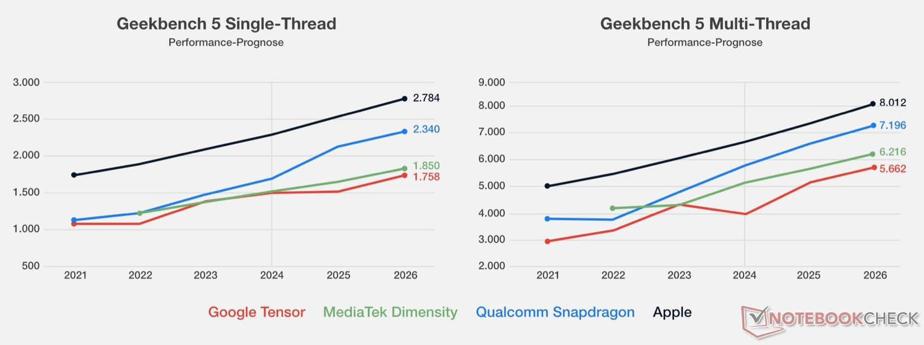 Potrivit datelor dintr-o sursă credibilă citată de Notebookcheck, propriile proiecții Google dezvăluie modul în care Tensor G5 și G6 se vor compara cu procesoarele emblematice de la concurenți precum Qualcomm, MediaTek și Apple. Publicația notează că aceste previziuni iau în considerare îmbunătățirile anticipate de performanță de la companii precum Qualcomm, despre care se așteaptă să introducă noi nuclee Nuvia cu un spor substanțial al capacității.