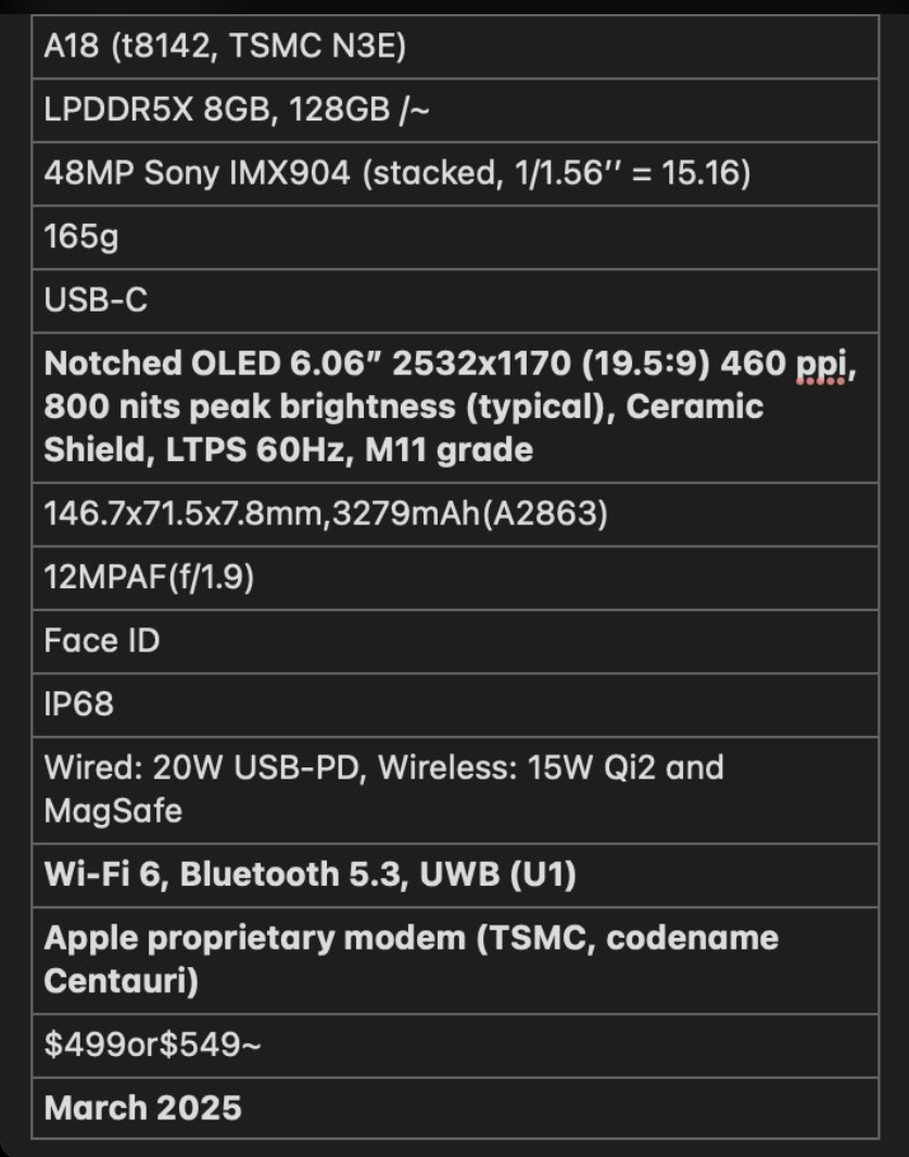Acum, informatorul @Jukanlosreve a postat ceea ce se pretinde a fi fișa de specificații a iPhone SE 4 pe X. Lista confirmă afirmația lui Gurman că telefonul va folosi SoC A18 și Face ID, adăugând că telefonul va avea 8 GB de memorie LPDDR5X, 128 GB. de stocare, o cameră selfie de 12 MP și o singură cameră de 48 MP care folosește un senzor Sony IMX904.