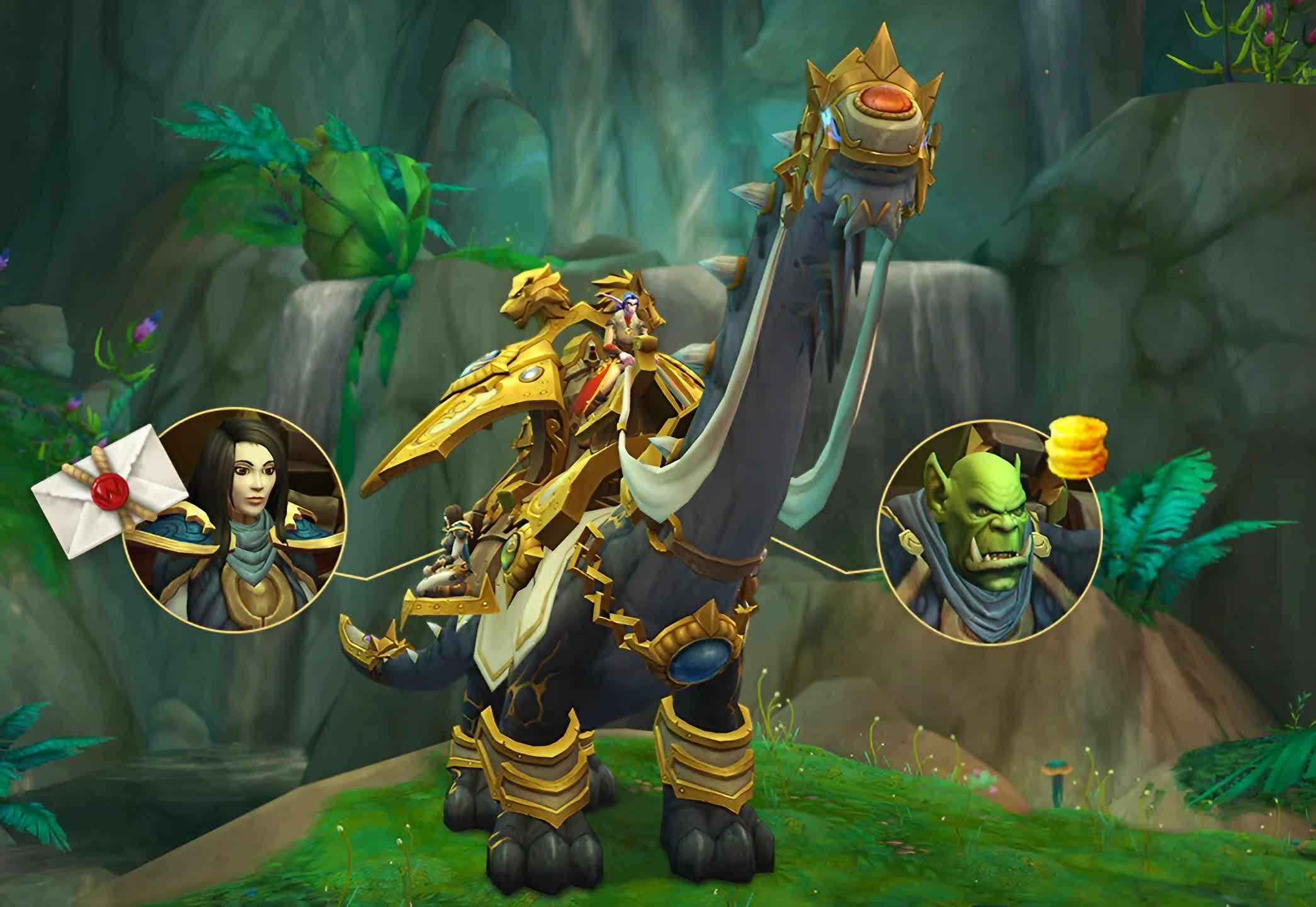 Supranumit Brutosaurul Aurit al Comerciantului, Blizzard a încercat să justifice prețul uluitor de 90 de dolari cu un ham pentru aniversarea a 20 de ani, decorat cu pietre prețioase care „reprezintă expansiunile World of Warcraft”. Montura include, de asemenea, funcționalități unice, permițând proprietarilor să acceseze atât casa de licitații, cât și cutia poștală de pe șa în timp ce traversează Azeroth.