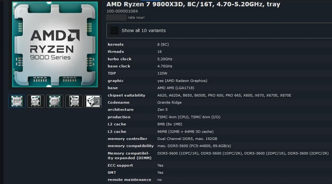 Conform unei liste de pe site-ul european de comparare a prețurilor Geizhals, Ryzen 7 9800X3D va avea opt nuclee Zen 5 și 16 fire. Se pare că oferă un ceas de bază de 4,7 GHz și un ceas de amplificare de 5,2 GHz – ambele mai mari decât cele ale modelului 7800X3D, care are un ceas de bază de 4,2 GHz și un ceas de amplificare de 5,0 GHz. De asemenea, se așteaptă ca 9800X3D să aibă un TDP de 120 W, care se potrivește cu 7800X3D.