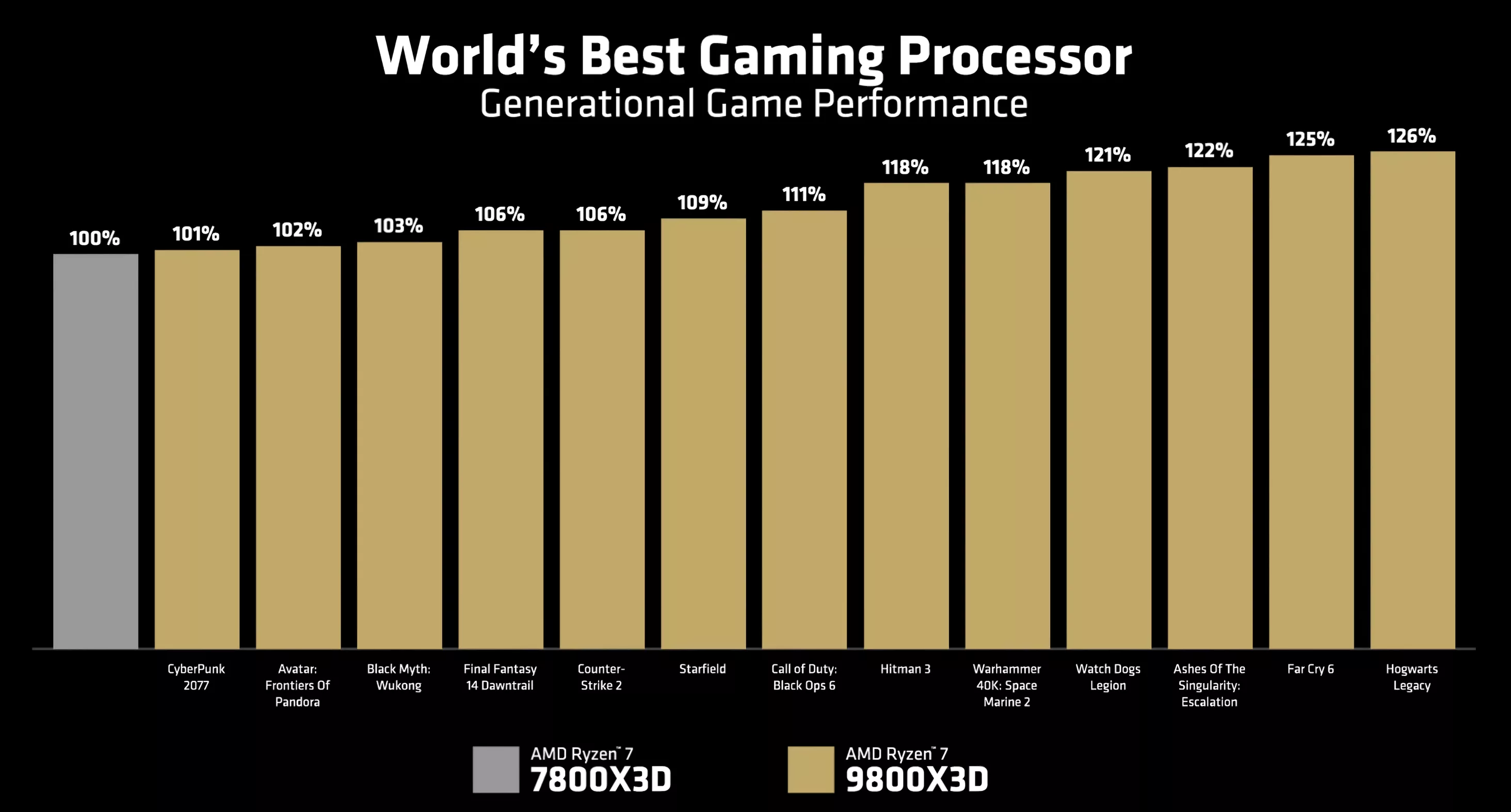 În titluri precum Far Cry 6, Hogwarts Legacy și Ashes of the Singularity, jucătorii se pot aștepta la o creștere de peste 20% a performanței în comparație cu 7800X3D conform AMD. Față de noul cip Arrow Lake, AMD susține că 9800X3D este cu peste 50% mai rapid în jocuri precum Watch Dog Legions și Cyberpunk 2077.