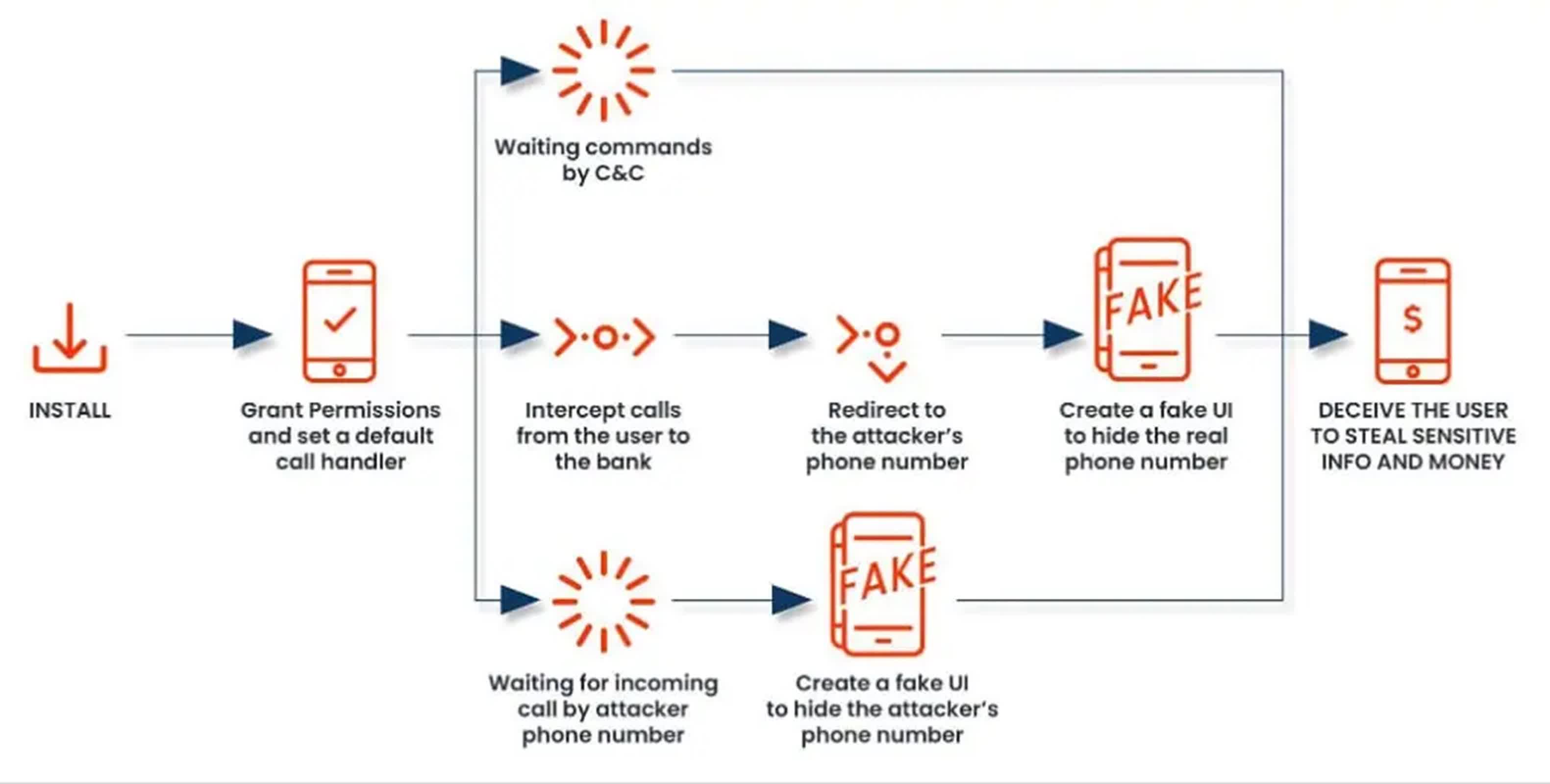 Identificat pentru prima dată în 2022, FakeCall este un software rău intenționat care a fost dezvoltat pentru a deturna conturile bancare. Face acest lucru prin interceptarea apelurilor efectuate către instituțiile financiare și apoi redirecționarea acestora către infractorii cibernetici care se uită la reprezentanții băncii pentru a extrage informații sensibile și pentru a obține acces neautorizat la fondurile victimelor – o escrocherie numită phishing vocal sau „vishing” pe scurt. În anii de după, a suferit o evoluție semnificativă și a reapărut cu noi capabilități alarmante, prezentând un pericol și mai mare pentru utilizatorii de Android din întreaga lume.