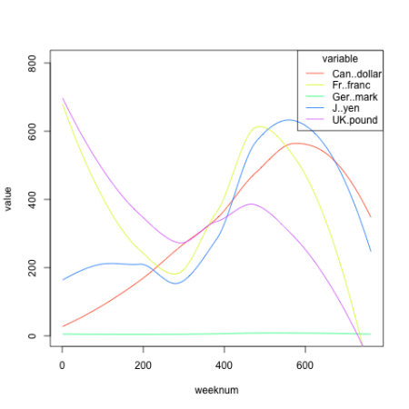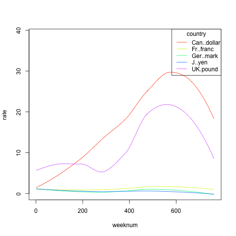 > data(currency) > head(currency) Can..dollar Ger..mark Fr..franc UK.pound J..yen 1 19 580 4.763 29 602 2 18 609 4.818 44 609 3 20 618 4.806 66 613 4 46 635 4.825 79 607 5 42 631 4.796 77 611 6 45 635 4.818 74 610 curr <- cbind(1:nrow(currency),currency) names(curr)(1) <- 'weeknum'