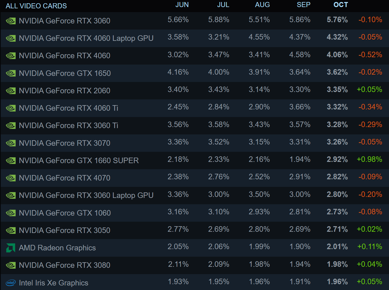Închiderea înseamnă că producția AD102, 103, 104 și 106 sa încheiat acum, lăsând doar linia 107 activă. O privire asupra celui mai recent sondaj Steam arată că GPU-ul pentru laptop RTX 4060 este al doilea cel mai popular card printre participanți, după RTX 3060. Desktop-ul RTX 4060 ocupă locul trei, în timp ce RTX 4050 se află pe locul douăzecea.