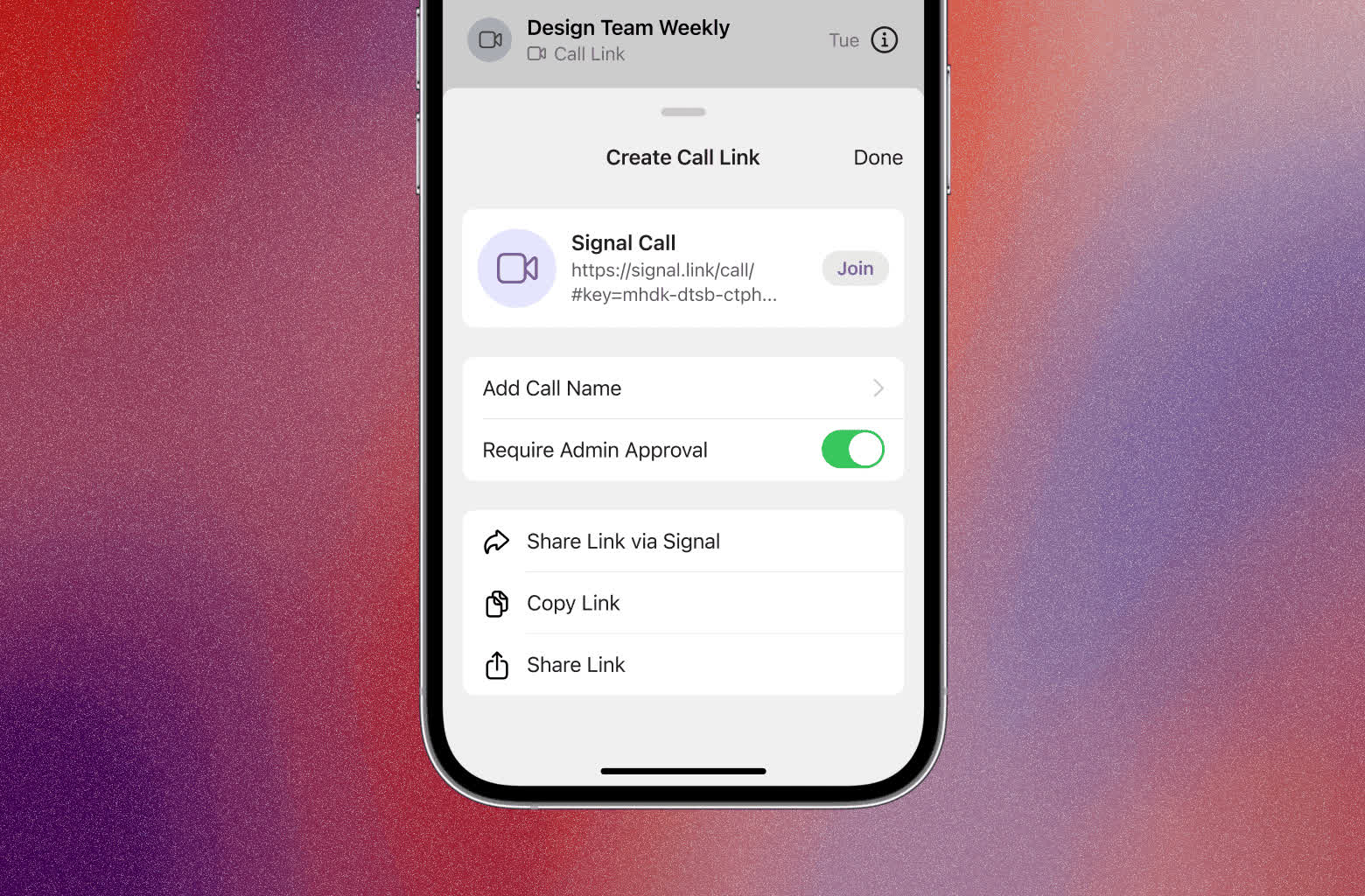 Pentru a crea o legătură de apel, deschideți Signal pe telefon sau desktop și navigați la fila Apeluri. Atingeți sau faceți clic pentru a crea un link de apel. Puteți decide dacă doriți să vă denumiți linkul și dacă doriți să aveți control asupra aprobării persoanelor care doresc să se alăture sau dacă cineva se poate alătura fără aprobare. În mod prestabilit, va trebui să aprobați persoanele înainte ca acestea să se alăture unui apel.