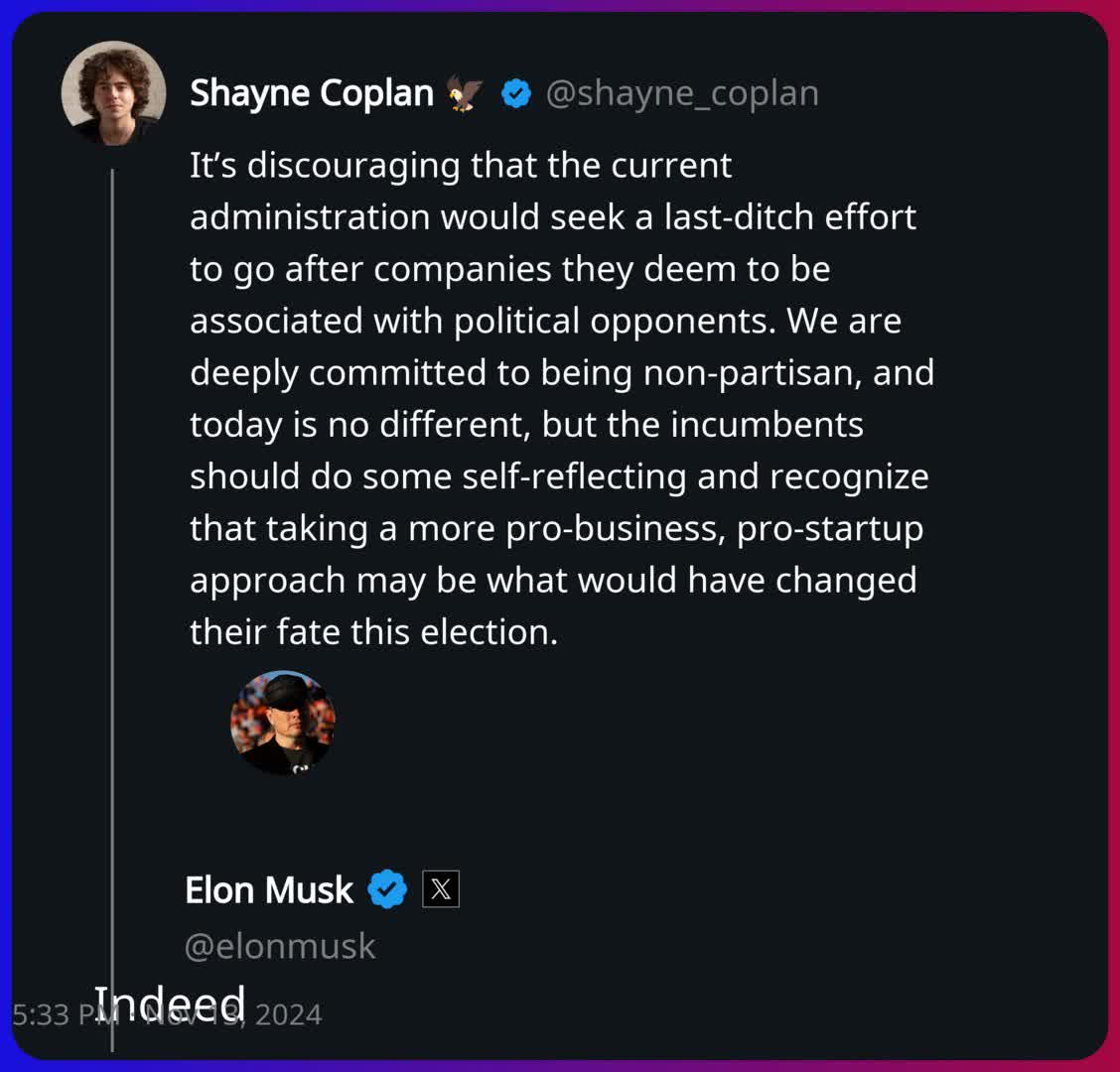 „Este descurajator faptul că actuala administrație ar căuta un efort de ultimă oră pentru a urmări companiile pe care le consideră asociate cu oponenții politici”, a scris Coplan. „Suntem profund angajați să fim nepartizani, iar astăzi nu este diferit, dar titularii ar trebui să se auto-reflecționeze și să recunoască faptul că adoptarea unei abordări mai pro-business, pro-startup-uri poate fi ceea ce le-ar fi schimbat soarta în aceste alegeri. .”