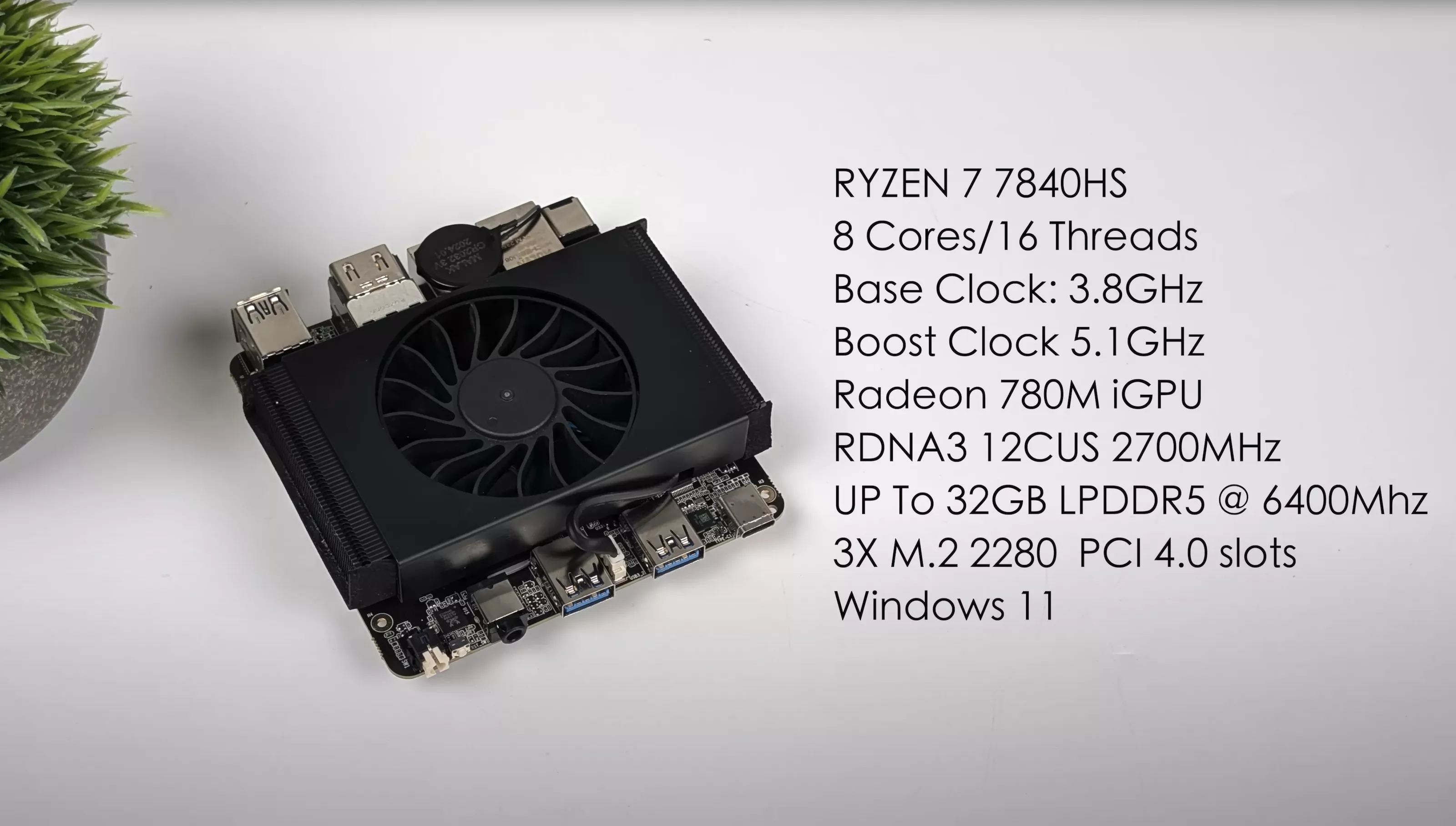 YouTuber ETA Prime a primit un model de recenzie, chiar dacă compania nu a publicat încă pagina Indiegogo (recenzia de mai sus). Specificațiile Next SBC nu sunt modeste. Această minune minune are un procesor Ryzen 7 7840HS și un GPU integrat Radeon 780M. APU Phoenix Point combină un iGPU RDNA 3 cu RAM LPDDR5, disponibil în variante de 16 GB și 32 GB.