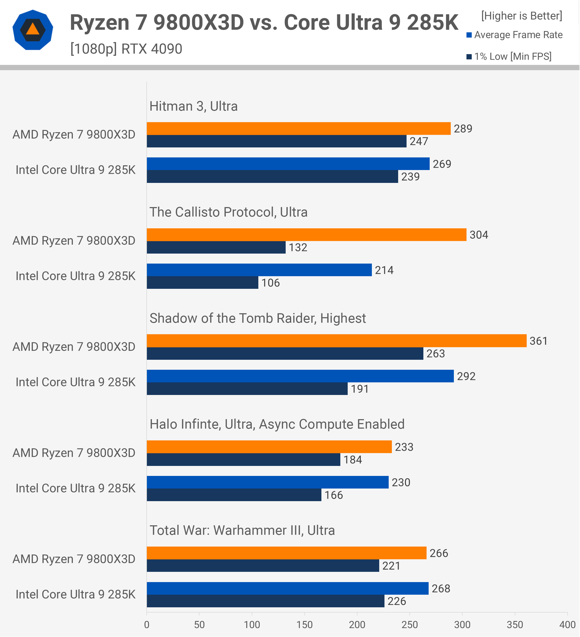 9800X3D este doar puțin mai rapid în Forza Horizon 5, dar arată o îmbunătățire cu 21% în Forza Motorsport. În Gears 5, procesorul Core Ultra 9 este complet depășit, gestionând doar 180 fps cu 1% minime de 101 fps. Astfel, 9800X3D este cu 62% mai rapid. Marjele sunt mai modeste în Ghost of Tsushima și Hunt: Showdown, deși 9800X3D este confortabil înainte în ambele cazuri.