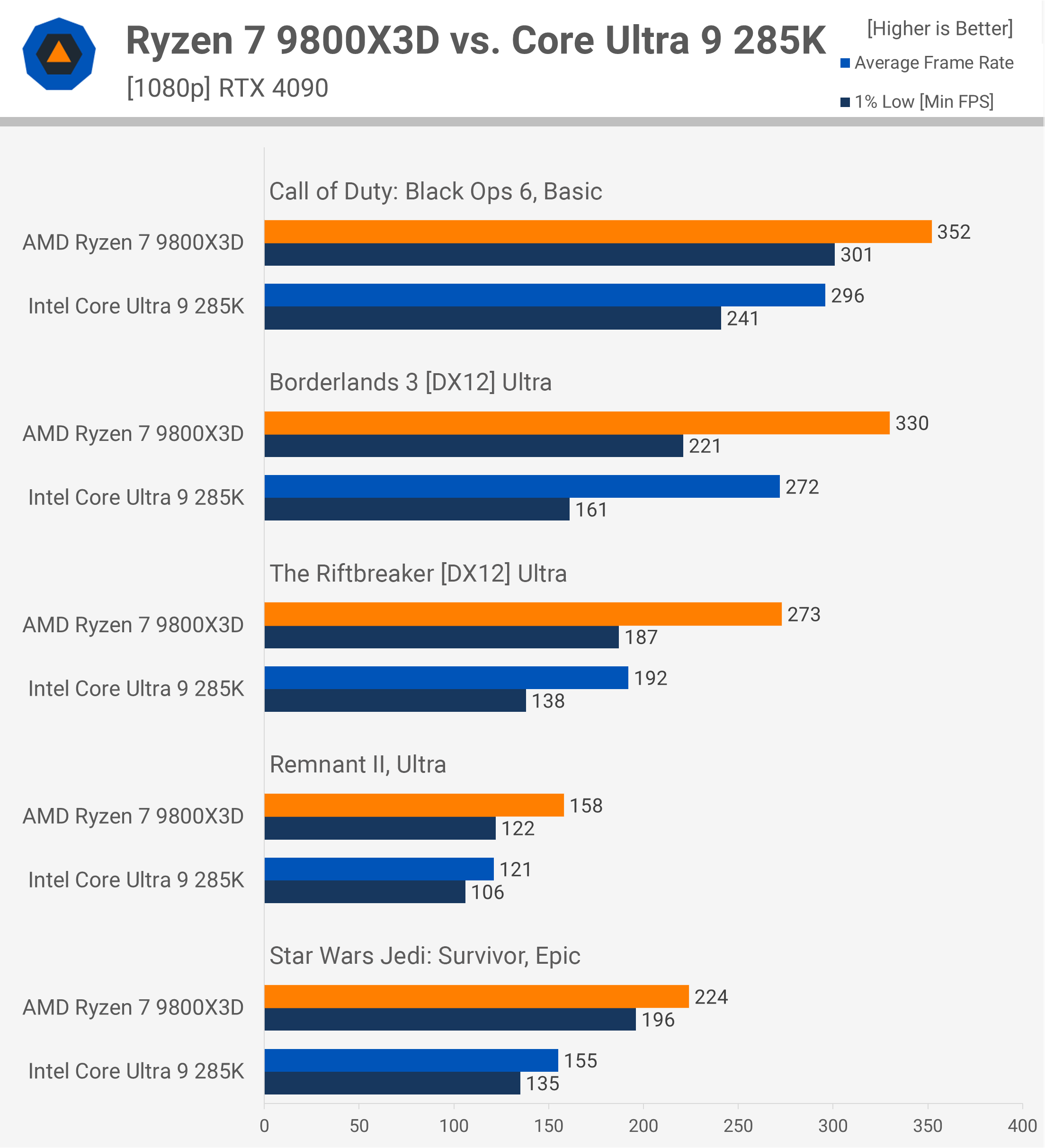 Pentru primul nostru lot de jocuri, să începem cu The Last of Us Part 1. Acesta este un exemplu în care 285K funcționează destul de bine, rezultând că 9800X3D este cu doar 5% mai rapid – o marjă neglijabilă. În acest scenariu, ambele procesoare oferă performanțe excepționale, așa cum este de așteptat de la procesoarele emblematice.