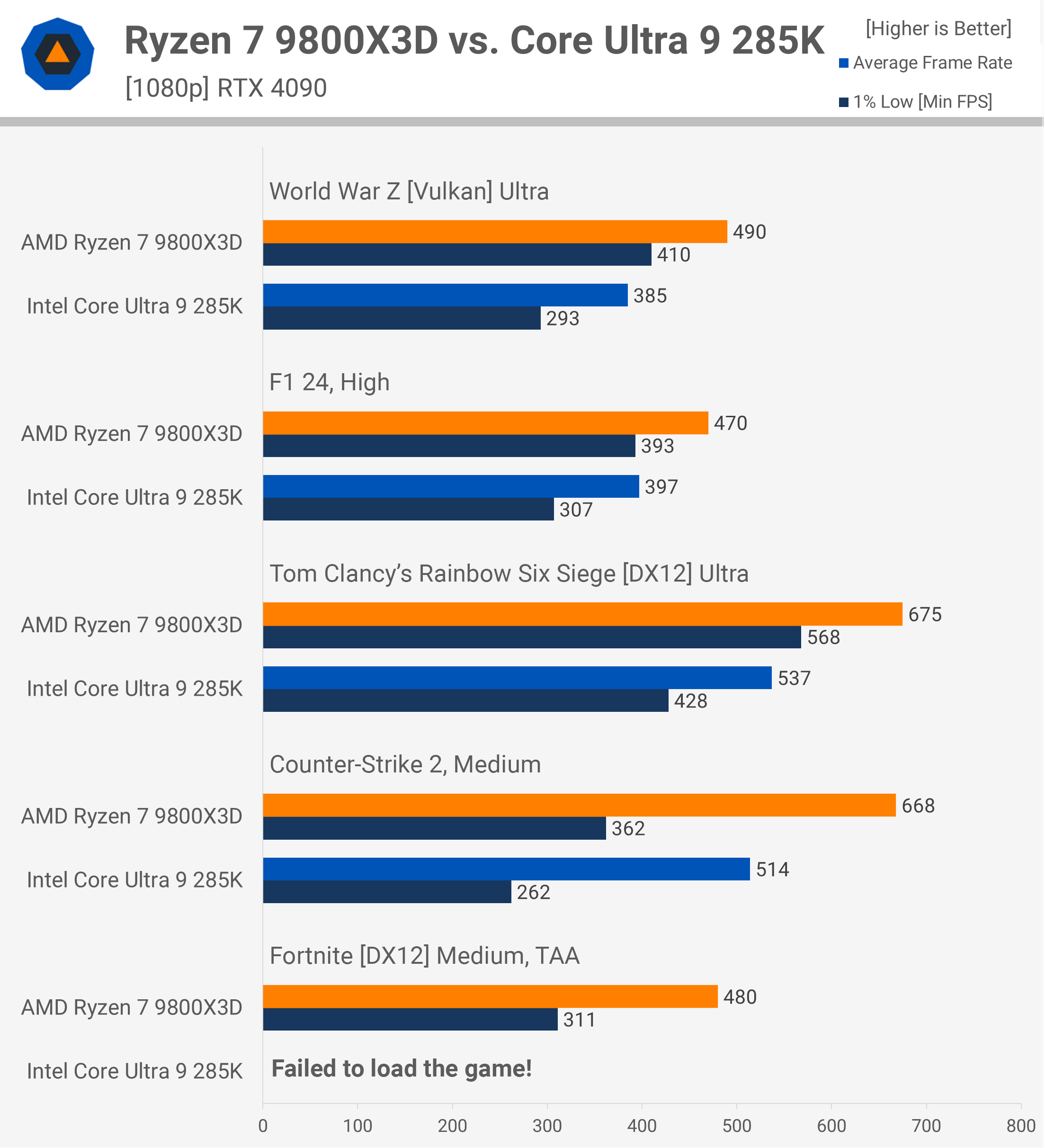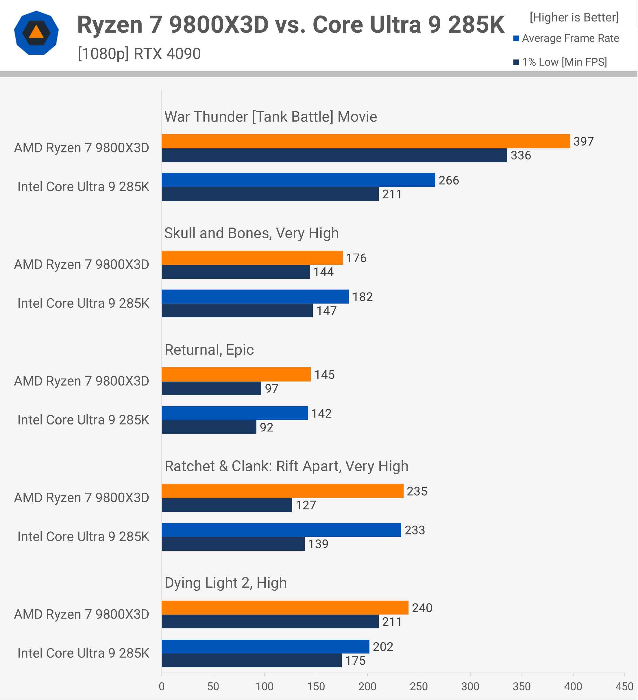 Și aici avem încă mai multe date despre jocuri. Cei care caută performanță maximă în War Thunder vor găsi 285K dezvăluitor, deoarece 266 fps nu este deosebit de impresionant în acest titlu. Aceasta înseamnă, de asemenea, că 9800X3D a fost cu aproape 50% mai rapid.