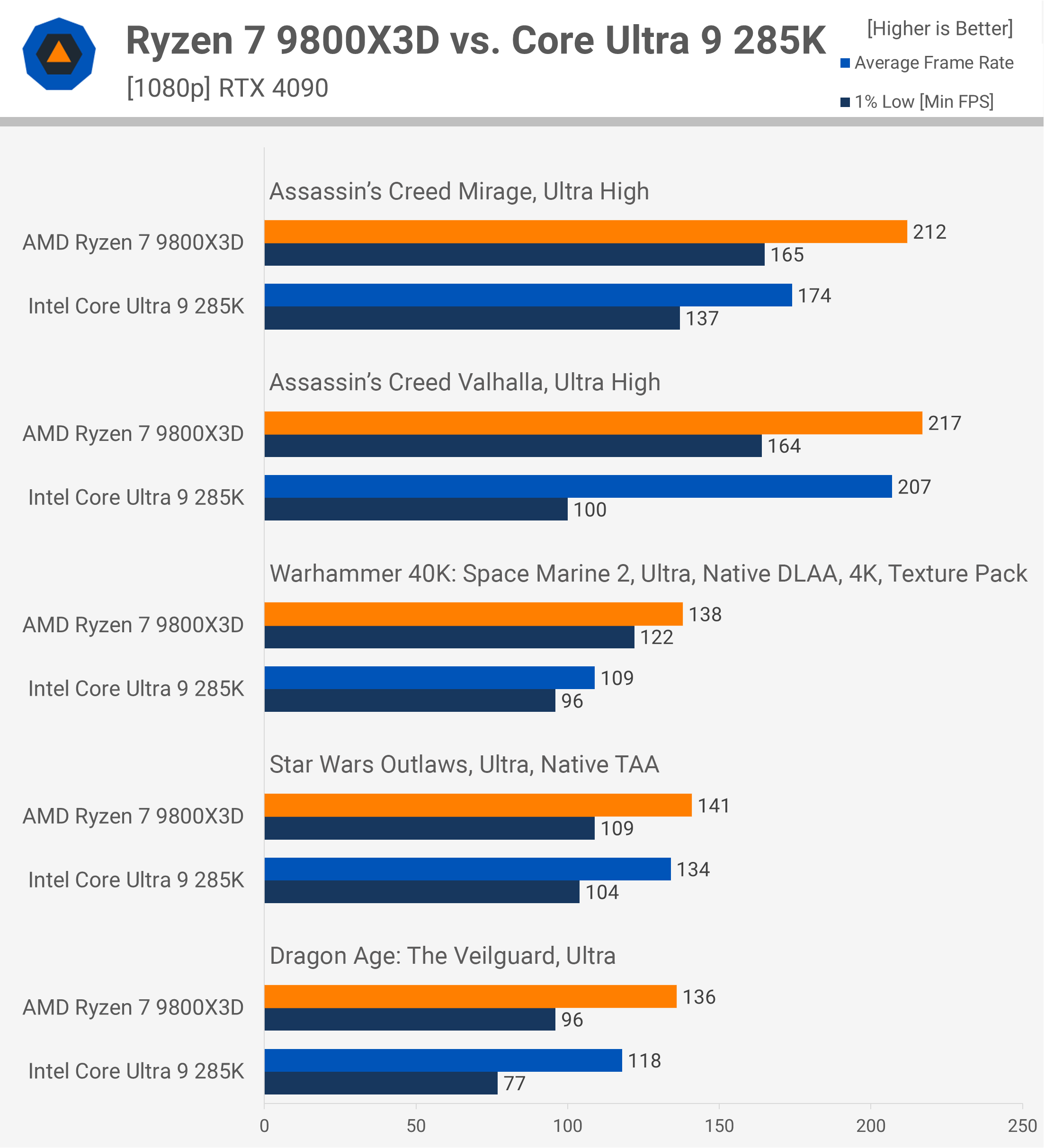 Space Marine 2 este foarte limitat de CPU, ceea ce face ca creșterea cu 27% a performanței de la 9800X3D să fie un avantaj semnificativ, în special pentru cei care folosesc afișaje cu rată de reîmprospătare ridicată. În mod similar, Star Wars Outlaws consumă mult CPU, dar aici, 9800X3D este cu doar 5% mai rapid. În cele din urmă, în Dragon Age: The Veilguard, 9800X3D menține un avans de 15%.