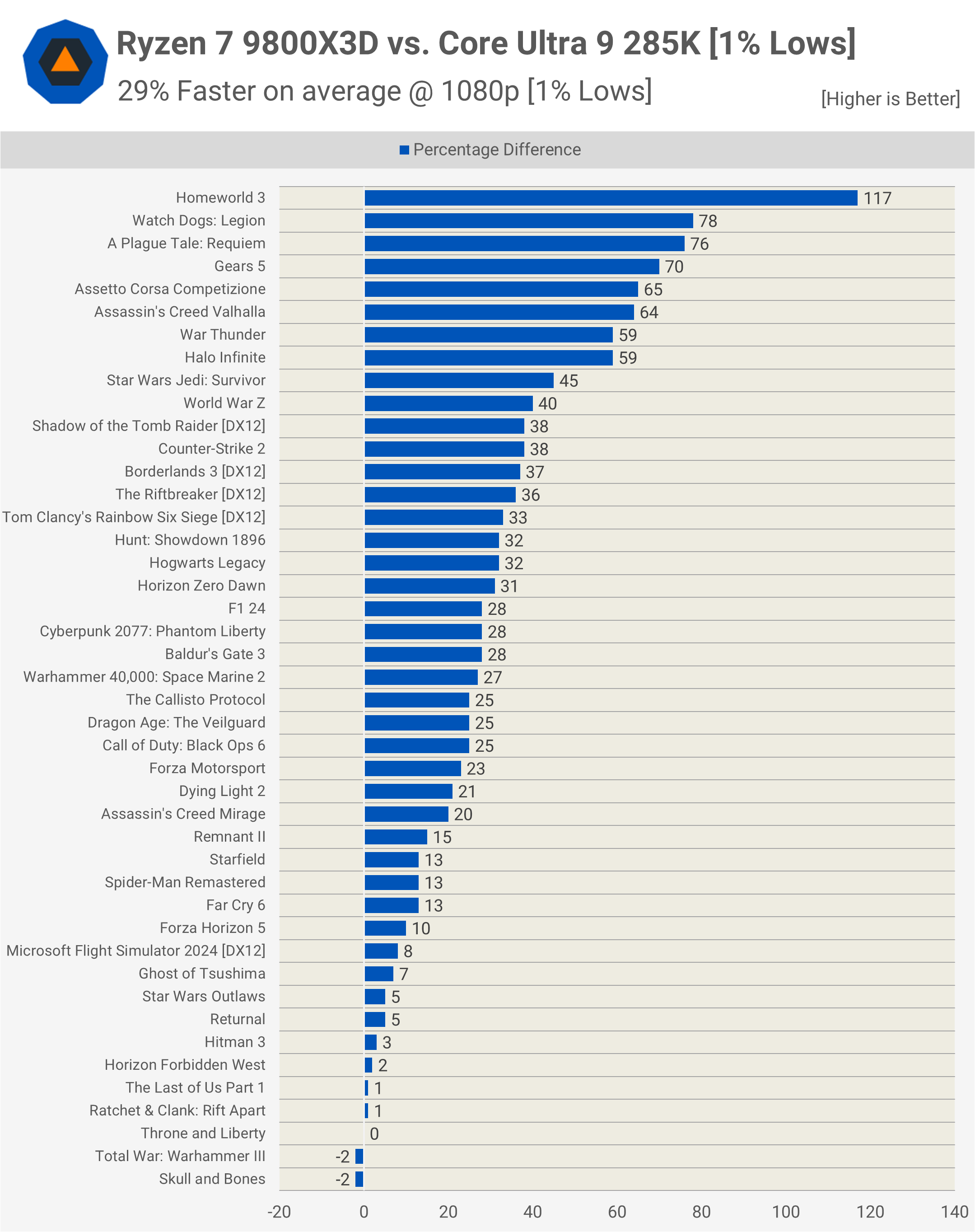 Iată cum se compară Ryzen 7 9800X3D și Core Ultra 9 285K între cele 45 de jocuri testate. Nu există cazuri în care procesorul Ryzen a fost mai lent. Marjele de 5% sunt considerate egalitate, deoarece diferențele de 1 – 3% nu sunt semnificative statistic.