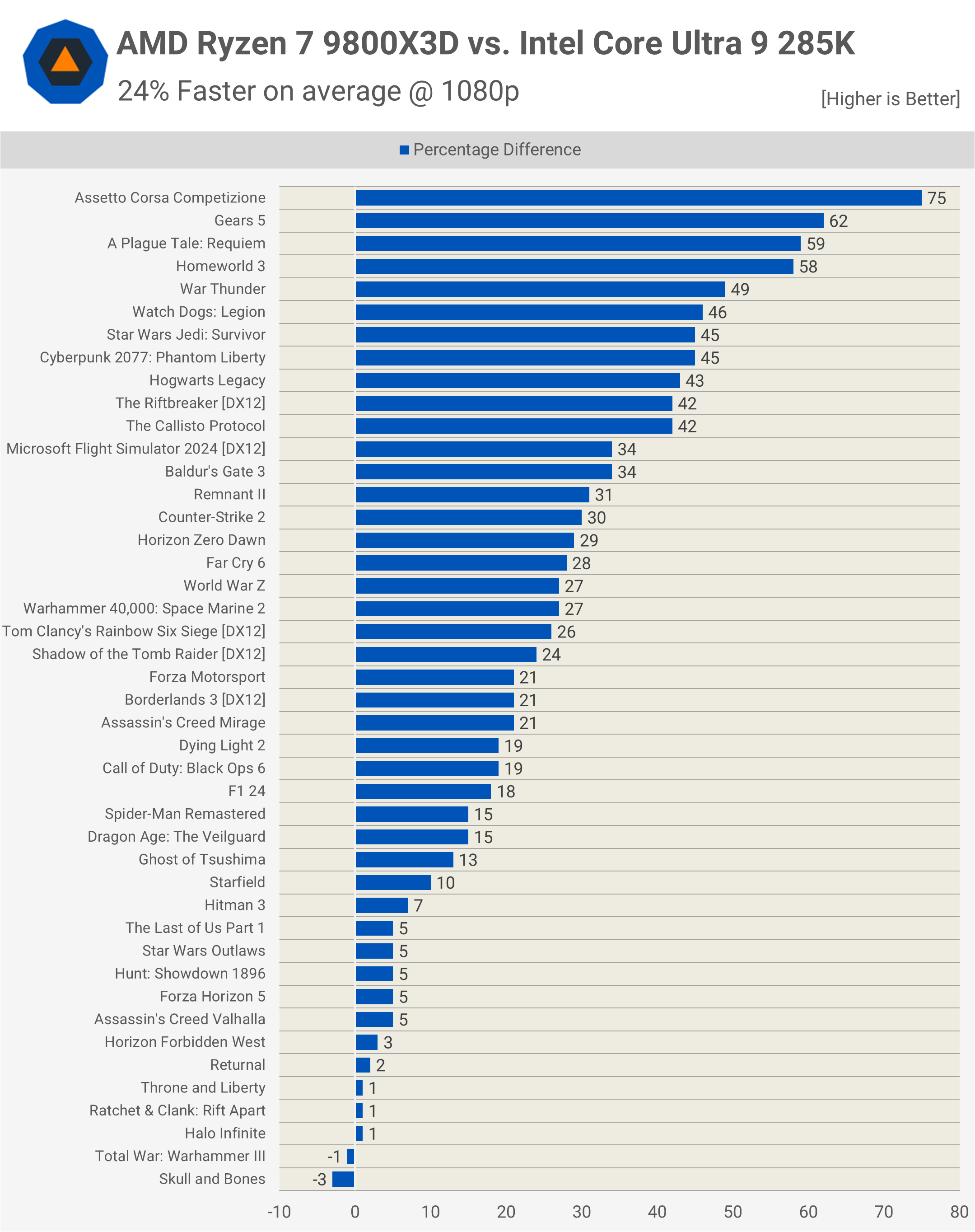 Ceea ce este deosebit de îngrijorător pentru 285K este numărul de jocuri în care procesorul Ryzen a condus cu peste 40%. Sperăm că acesta este ceva pe care Intel îl poate aborda, dar se pare că 285K pur și simplu nu este ideal pentru jucători.