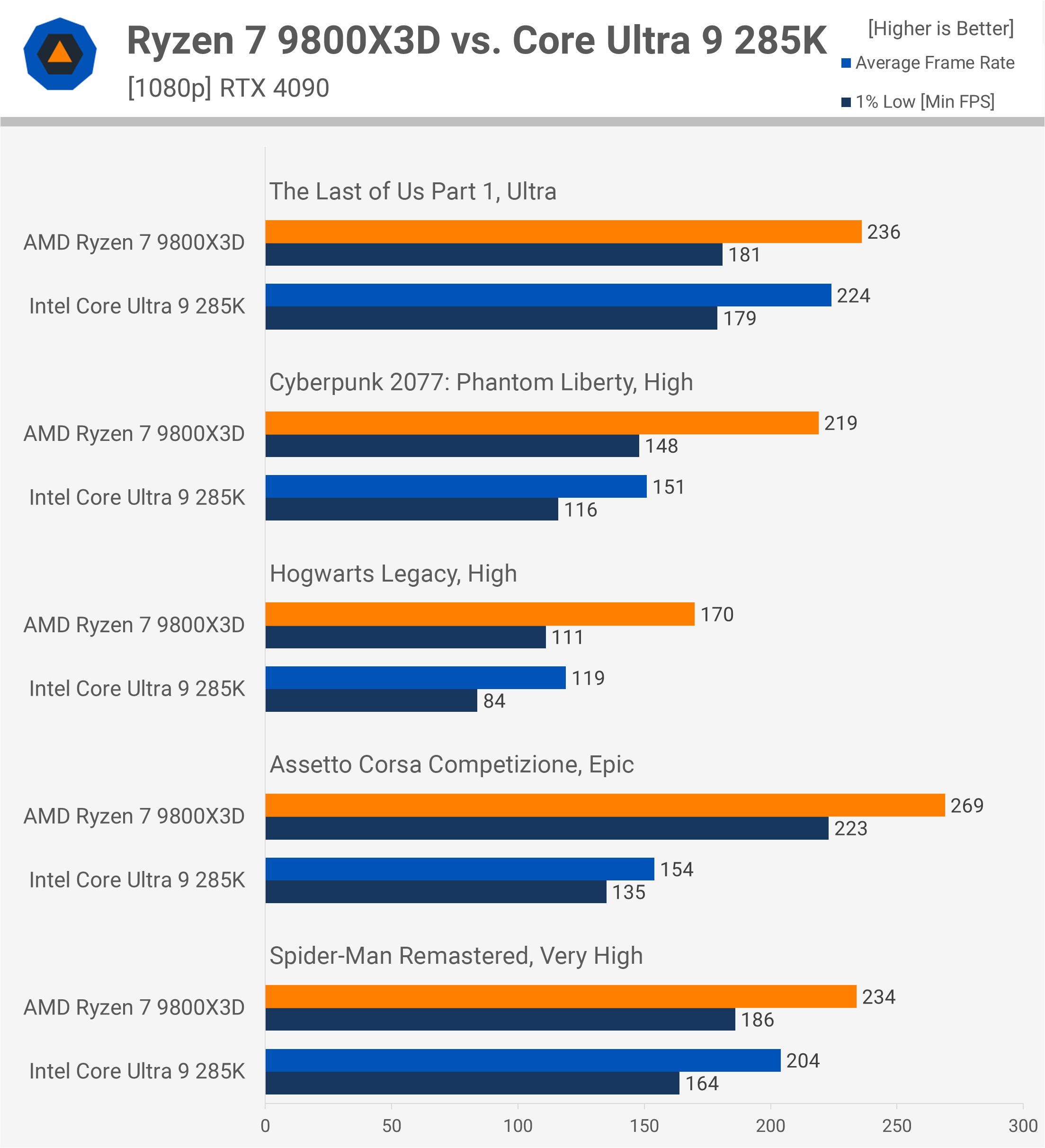 Cu toate acestea, 285K miroase în Cyberpunk 2077, sufocând RTX 4090 la doar 151 fps. Ca rezultat, procesorul Ryzen 7 este cu 45% mai rapid impresionant. 9800X3D zdrobește și 285K în Hogwarts Legacy, oferind performanțe cu 43% mai bune. Marjele sunt și mai brutale în ACC, unde procesorul AMD depășește CPU Intel cu 75%. În timp ce performanța se îmbunătățește pentru Intel în Spider-Man Remastered, 9800X3D își menține în continuare un avans de 15%.