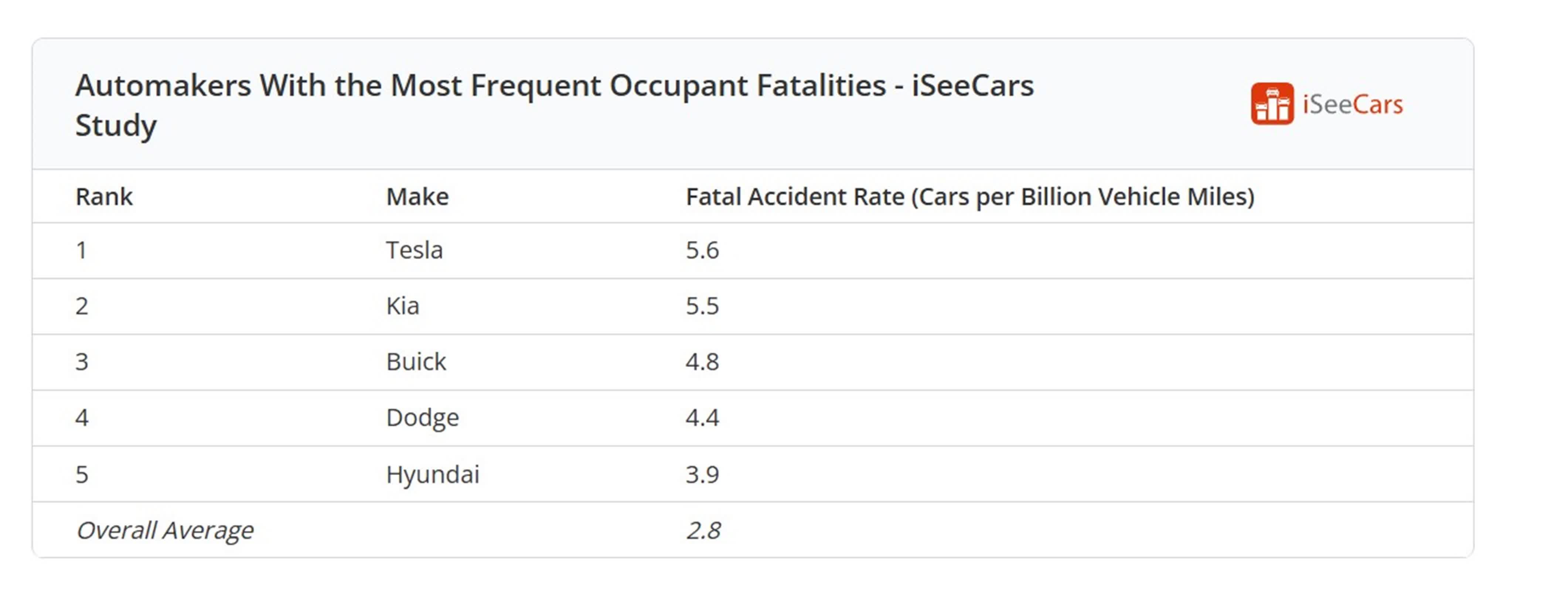 Studiul, care a analizat coliziunile fatale din 2017 până în 2022, care au implicat modele de mașini din 2018 până în 2022, a constatat că Tesla a avut 5,6 accidente mortale pe miliard de mile parcurse, depășind cu puțin 5,5 pe miliard de mile ale Kia. Această statistică plasează Tesla în fruntea listei pentru mărcile cu cea mai mare rată de accidente mortale.