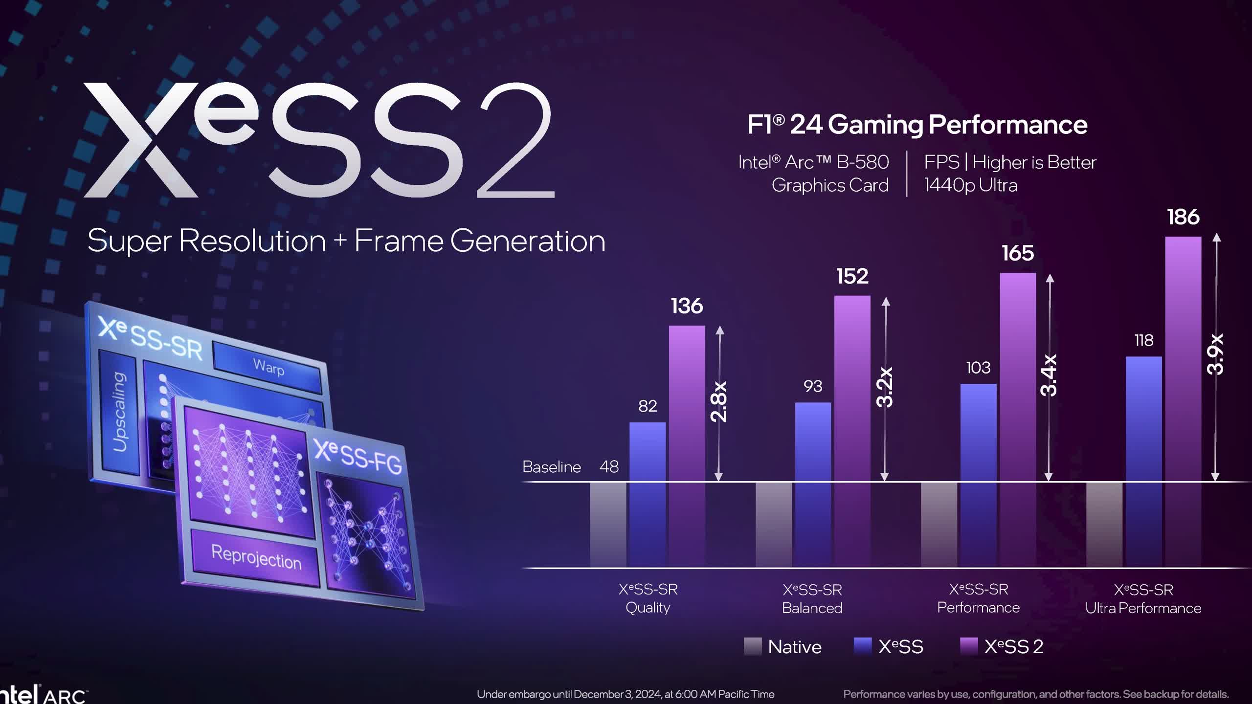 Activarea XeSS 2 scade ușor rata de randare nativă a GPU-ului, dar rata de ieșire a cadrelor este mai mare și mai fluidă. De exemplu, în F1 24, Intel citează o creștere de la 82 la 136 FPS atunci când folosește creșterea calității XESS. Acei 136 FPS după generarea cadrelor implică o rată de randare nativă de 68 FPS – puțin mai lentă decât cea nativă, dar dublată pentru o ieșire mai fluidă.