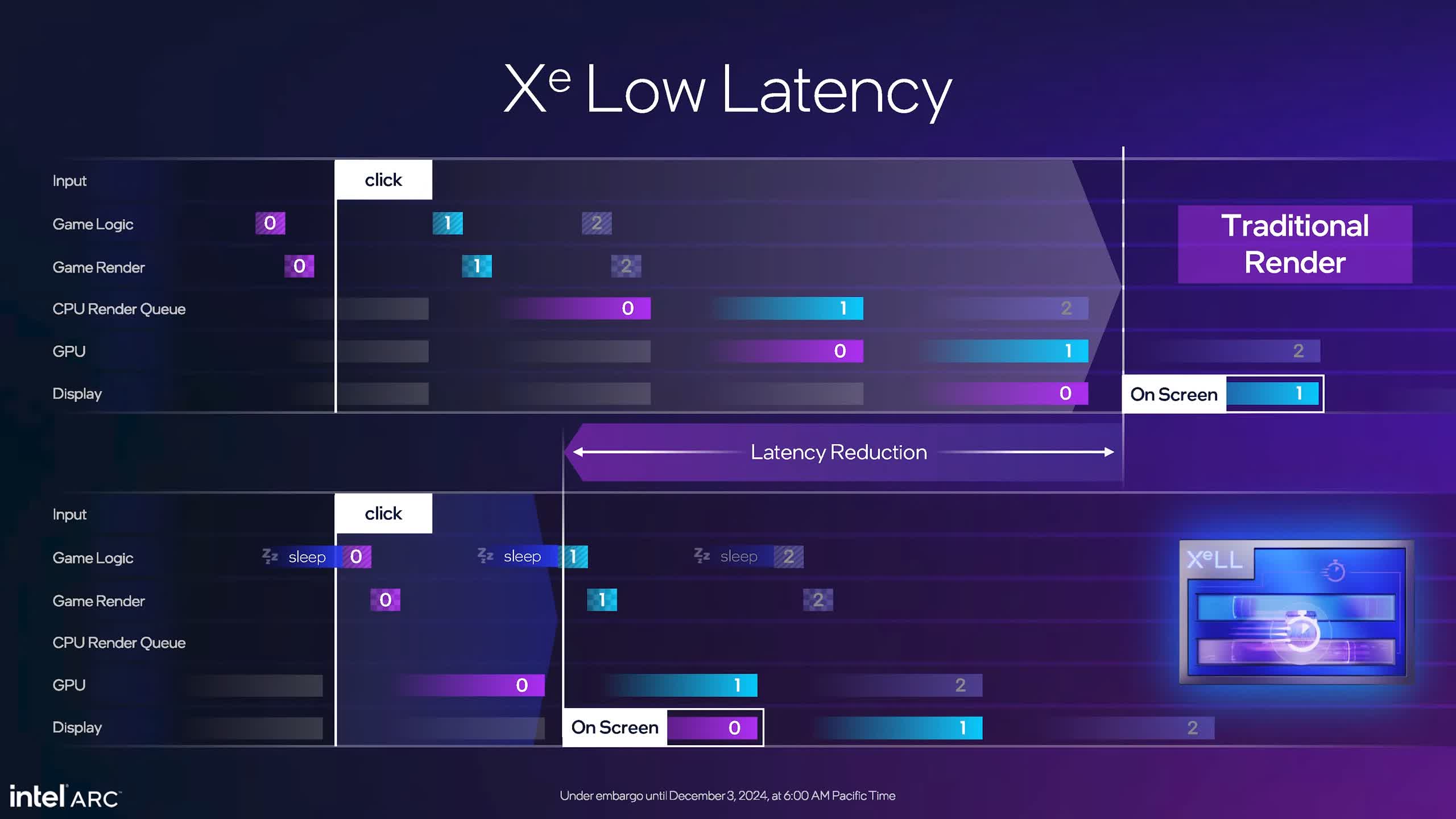 O completare este Xe Low Latency, un echivalent cu Nvidia Reflex care urmărește să reducă latența de redare a jocului pentru a ajuta la atenuarea lipsei de îmbunătățire a latenței prin activarea generării de cadre. La fel ca generarea de cadre XeSS 2, XeLL trebuie integrat în jocuri.